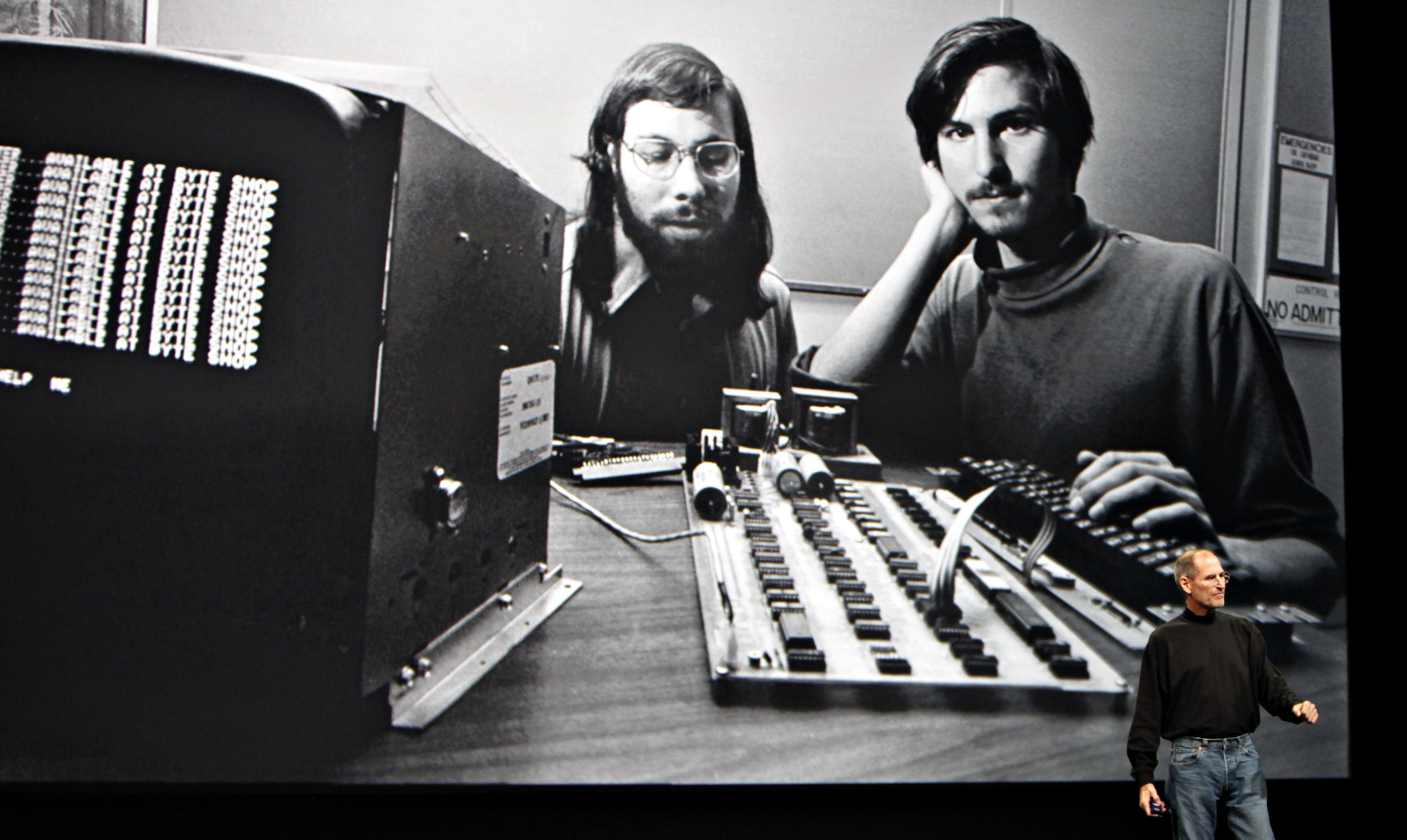 Steve Jobs speaks in front of a file photograph of himself and Apple co-founder Steve Wozniak, in San Francisco. (Photographer: Tony Avelar/Bloomberg)