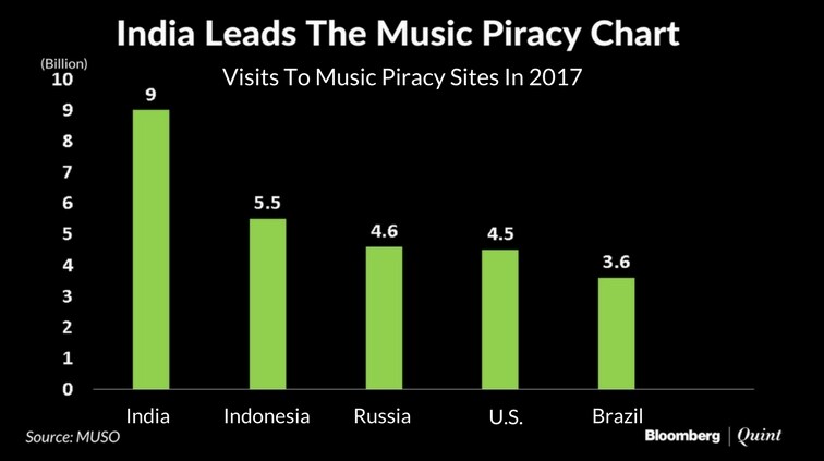 Yet, getting users to pay will be a challenge. Pirated content continues to be the most popular source of music. Indians visited websites providing unlicensed music 9 billion times in 2017, according data shared by analytics firm MUSO to BloombergQuint. It's a threefold jump over the previous year as the nation continues to lead the global music piracy chart. Clamping down on websites offering pirated songs has worked only partially.