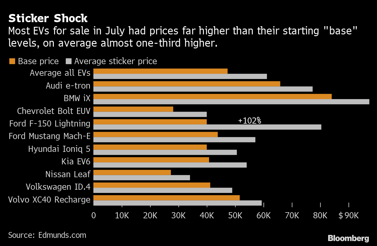 Much has been written about unctuous car salesmen adding “market-adjustment” fees to capitalize on the current supply-demand imbalance of vehicles. But while that's certainly an issue, most electric machines are getting pushed up to luxury-car levels far earlier — before even leaving the factory. In July, the average US starting price for a battery-powered vehicle — the figure shown in car commercials and marketing materials — was $47,636. The average sticker price for EVs that were actually made and shipped to dealerships, however, was $61,251, almost one-third higher, according to Edmunds. It's not that auto companies don't have affordable electric cars; it's just that they aren't making them, choosing instead to crank out more lavish (and profitable) versions.