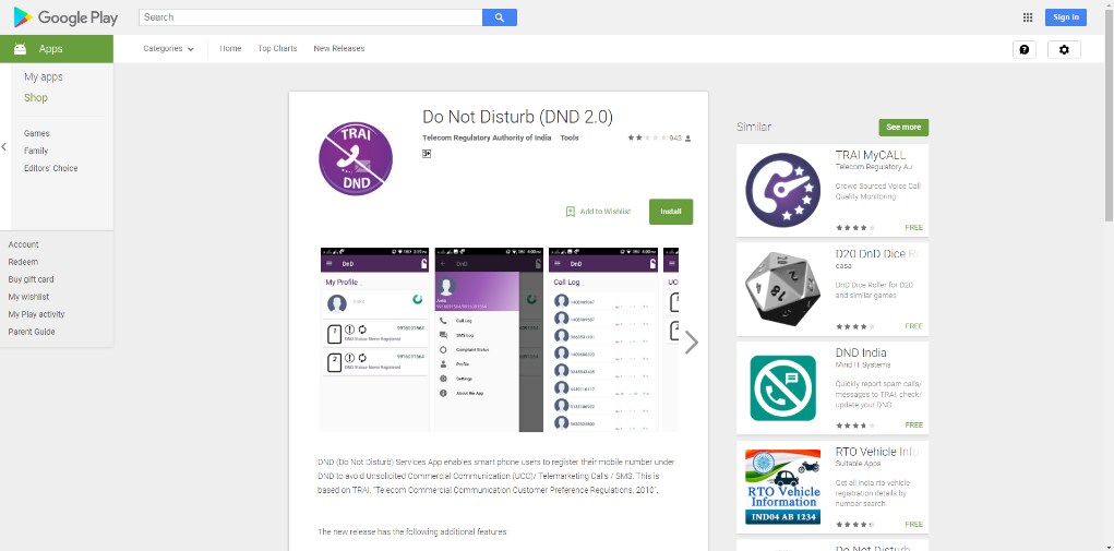 Google's Play Store describes the DND Services App as one that enables Android phone users to register their mobile number under DND, “to avoid Unsolicited Commercial Communication (UCC)/ Telemarketing Calls / SMS.”