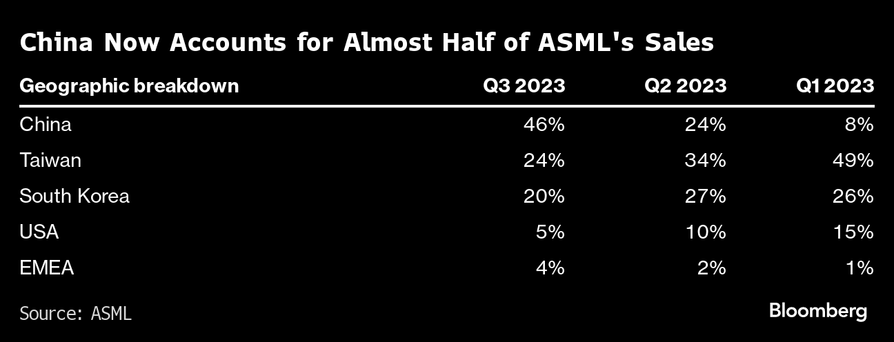 Between July and November, China's imports of lithography machines surged more than five times to $3.7 billion, according to Chinese customs data. China accounted for nearly half of ASML's sales in the third quarter — compared with 24% in the previous quarter and 8% in the three months ending in March — as companies there rushed to import its machines before export controls take effect.