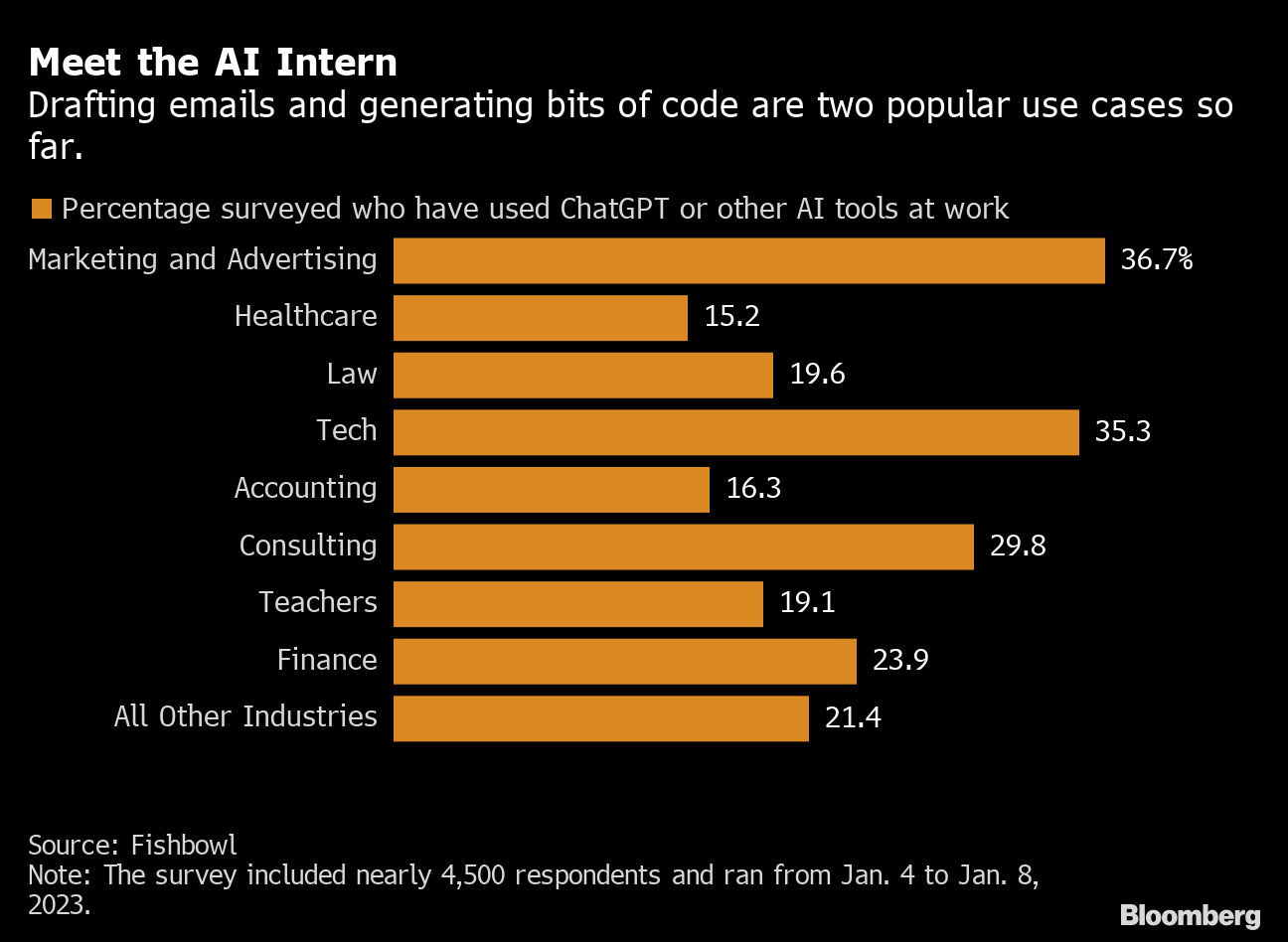 Marketing professionals have been particularly keen to test-drive the tool: 37% said they've used AI at work. Tech workers weren't far behind, at 35%. Consultants followed with 30%. Many are using the technology to draft emails, generate ideas, write and troubleshoot bits of code and summarize research or meeting notes.