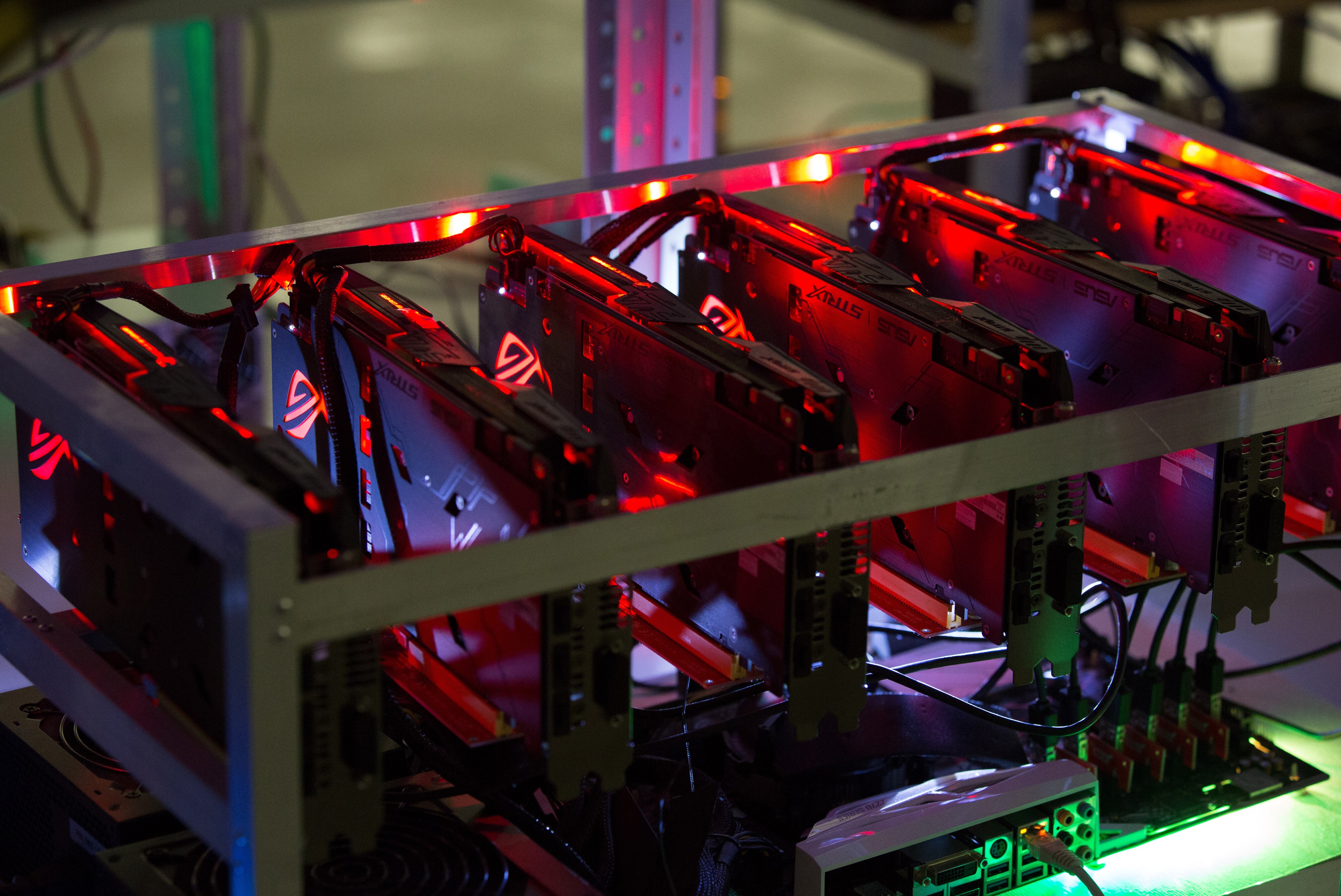 A cryptocurrency mining rig composed of Asus Strix machines operates at the SberBit mining ‘hotel’ in Moscow, Russia. (Photographer: Andrey Rudakov/Bloomberg)