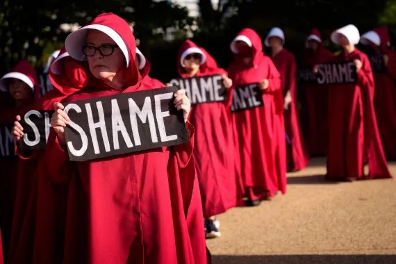 🇺🇸 Protesters dressed as handmaids from "The Handmaid's Tale" hold a protest near a photo of President Donald Trump in Washington, DC. Activists are staging multiple protests on Capitol Hill and outside the White House as lawmakers return from summer recess. pic.twitter.com/Xdhg4JuXdA