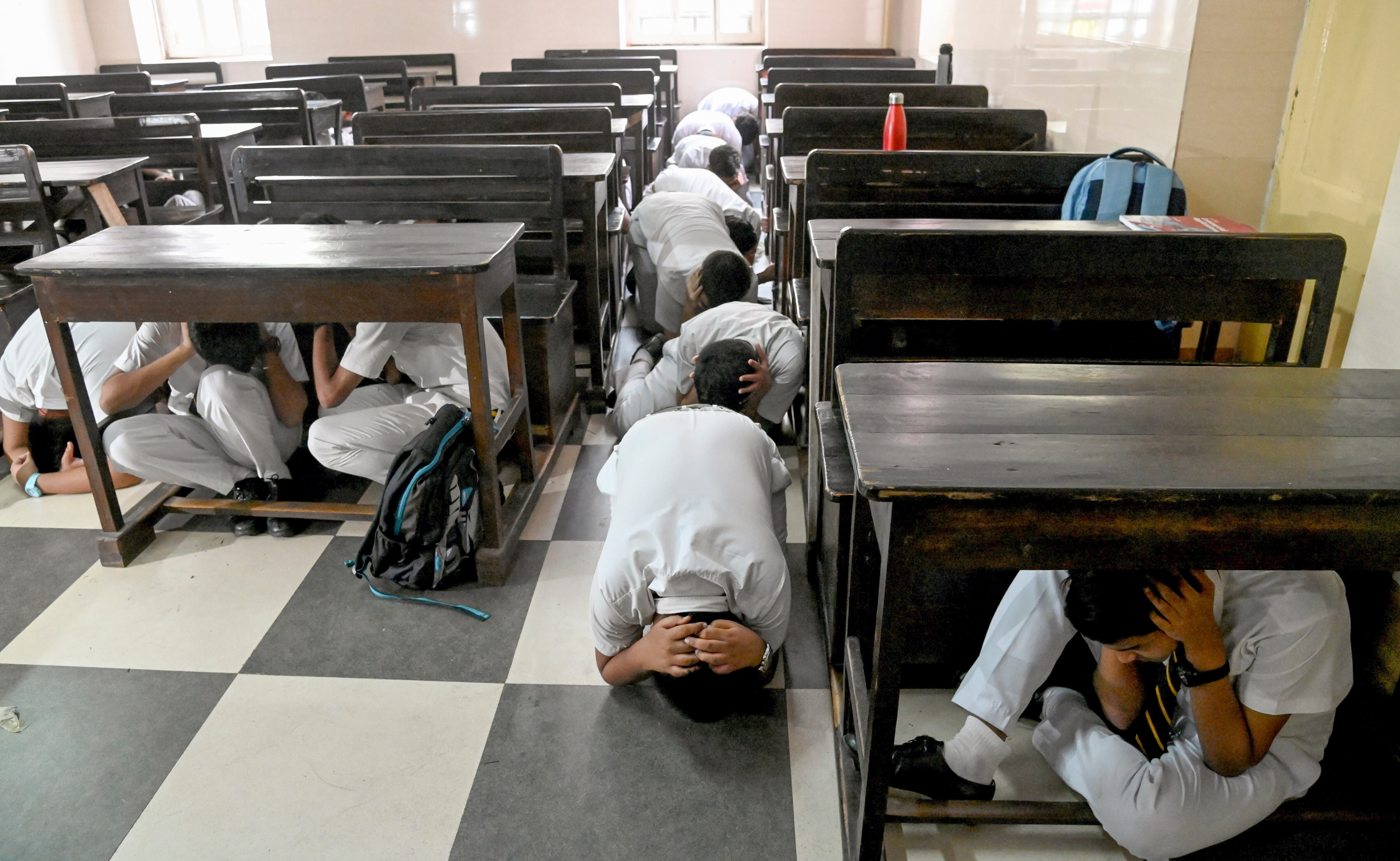 As part of the nationwide civil defence drill, school students in Kolkata participate in a drill.