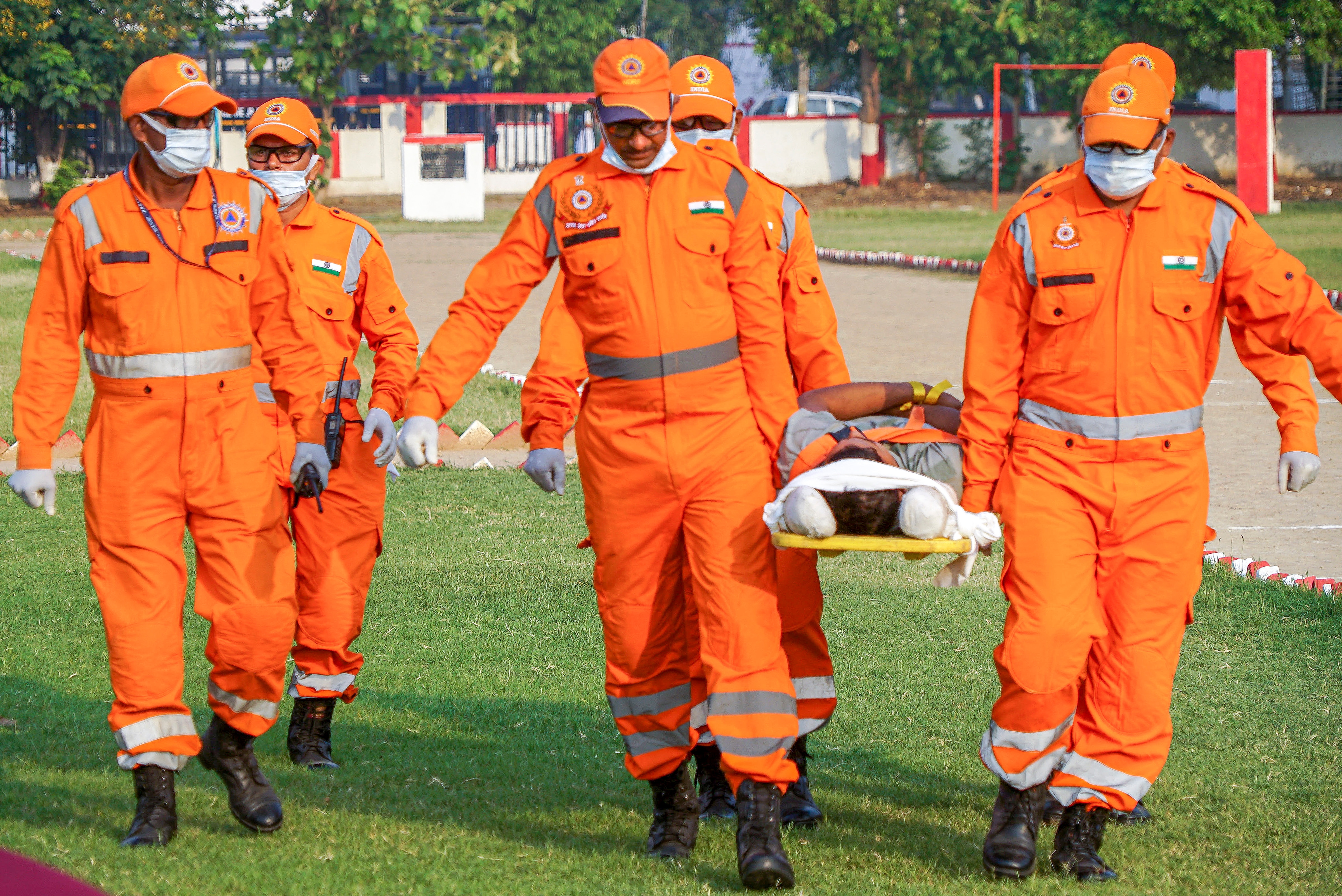 Firefighters and civil defence personnel participate in a civil mock drill.