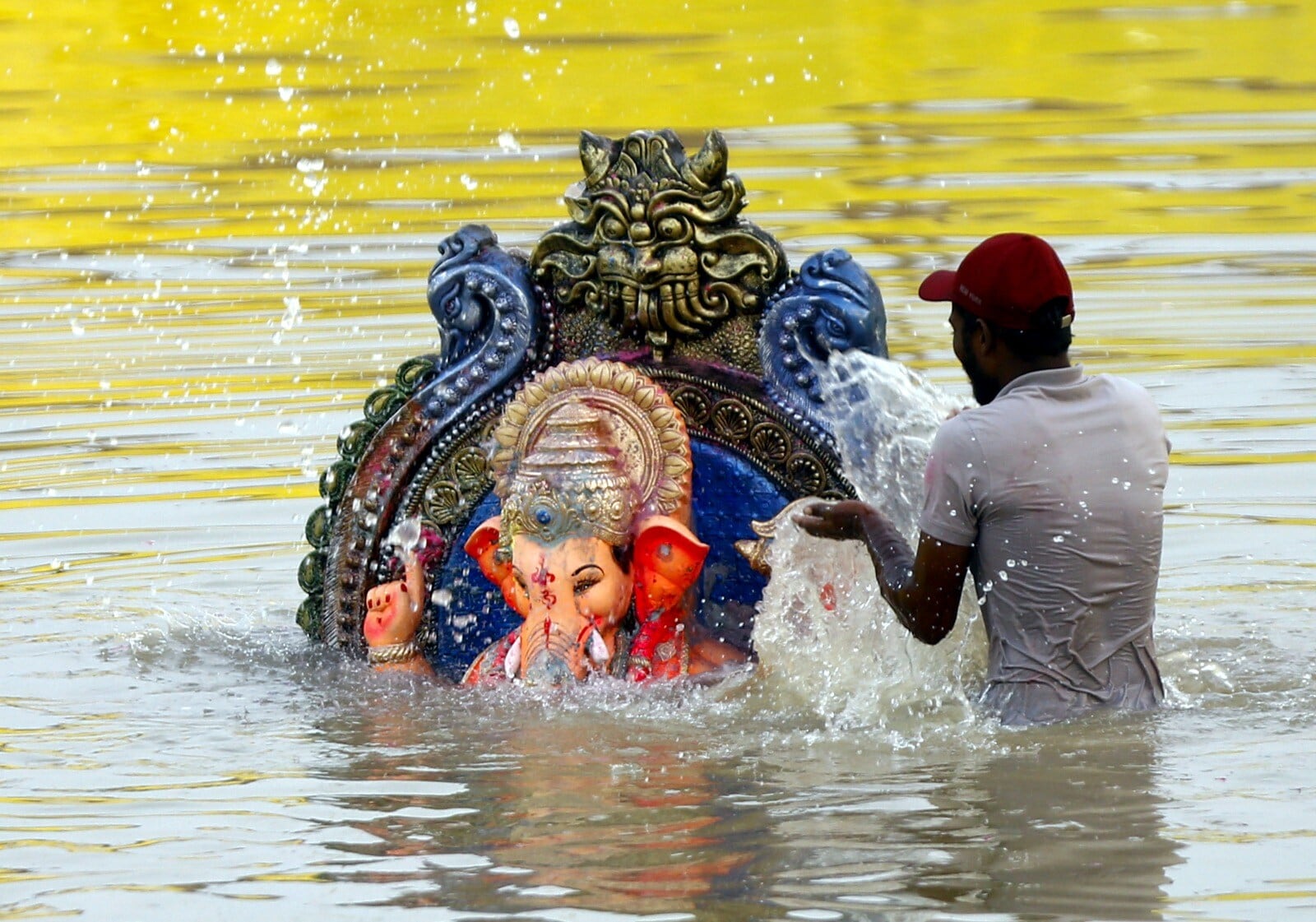 As the Ganesh idols are carried in grand processions following a special aarti conducted by families and communities, the atmosphere resonates with chants of "Ganpati Bappa Morya, Pudhchya Varshi Lavkar Ya," meaning "O Lord Ganesha, return soon next year".