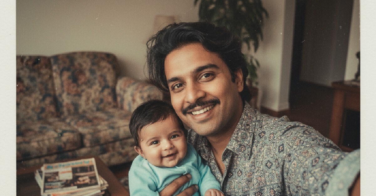 Google Gemini AI Photo Editing Prompt: How To Create A Retro Selfie Holding A Baby Version Of You?