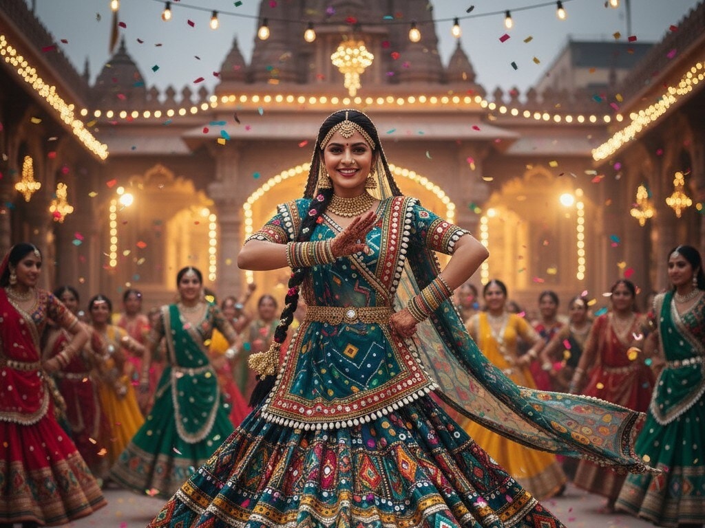2. Create a 4K HD Garba dance scene. The girl should be mid-twirl in a flowing ghaghra choli, holding dandiya sticks in both hands. Add golden-hour sunlight and retro 90s film grain for a cinematic effect.