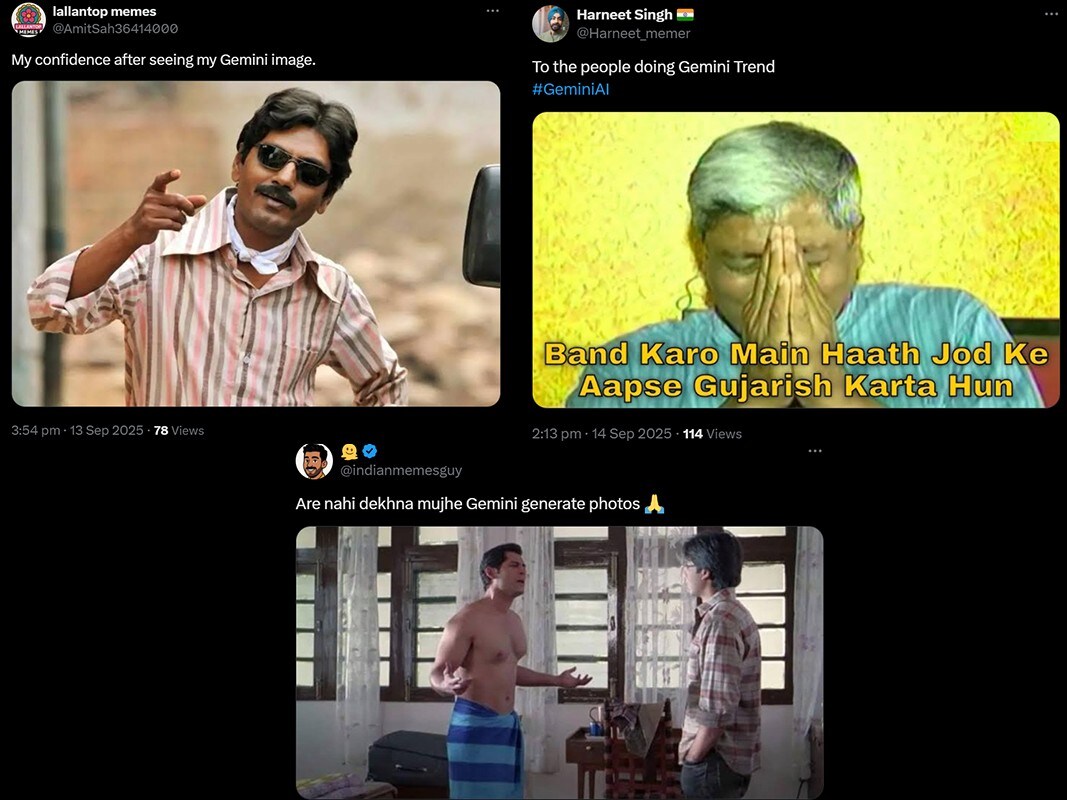 September 14, 2025And for those already tired of the craze, one meme shows a person with folded hands and the text overlay, “Bandh karo, main haath jodke aapse gujarish karta hoon,” accompanied by the caption: “To the people doing Gemini Trend.”