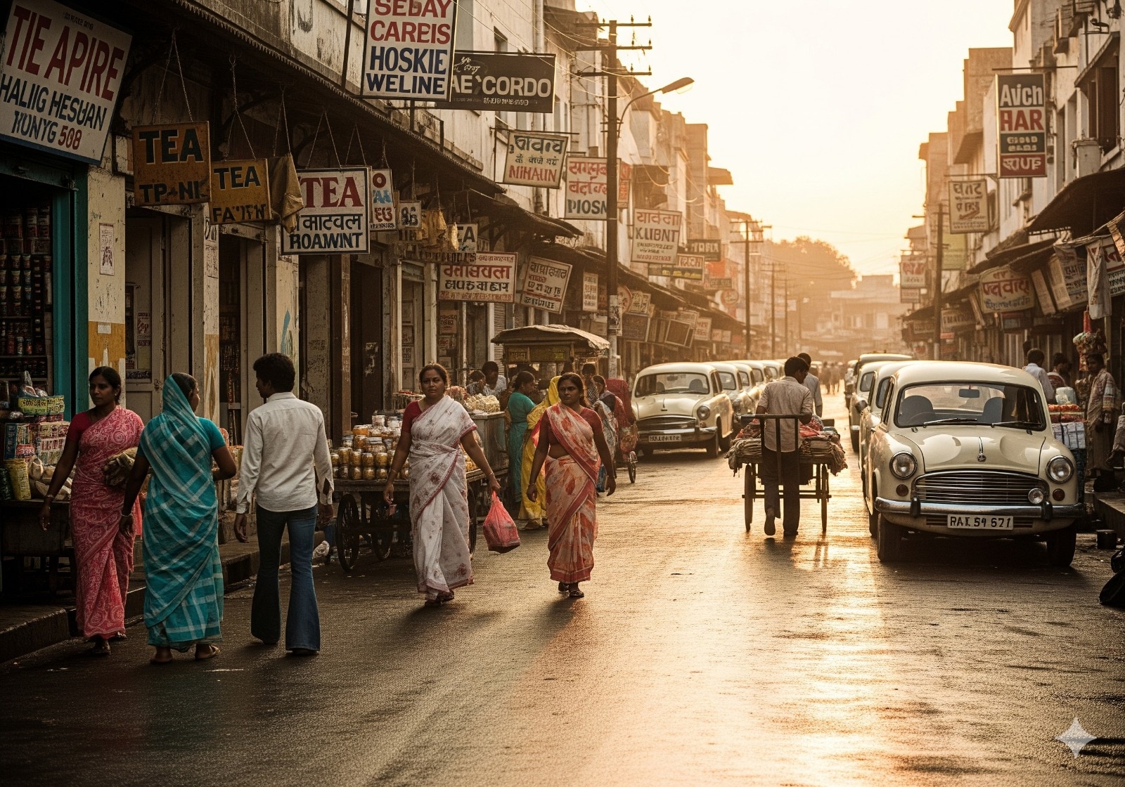 Working with the uploaded image, generate a hyper-realistic environment retaining the look of the original face. Bring the scene to an Indian street in the 1970s at sunset, when the street is shining after a drizzle. Include hand-painted signboards for the shops in Hindi and English in the distance. Feature women in bright cotton sarees and men in bell-bottom jeans walking alongside tea shops and grocery stores. Old Ambassador automobiles are parked on the roadside. Wooden signboards are hung on narrow doorways, and a cart pusher drives his cart loaded with goods through the busy street. To achieve the old look, use subtle film grain and a light sepia tone.