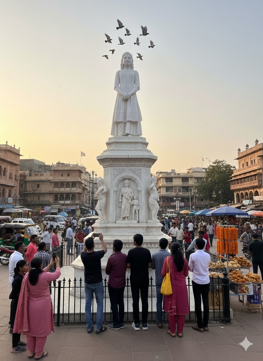 Using the uploaded photo as a guide, create a photorealistic statue with an identical face. Imagine the white marble statue in the centre of a busy square in an Indian city. The statue needs to be set on top of a high pedestal. The polished marble is bathed in afternoon sunlight. Overhead, a flock of pigeons are seen circling. Tourists and families gather around, with some admiring the statue and others taking selfies. Autorickshaws, cars and two-wheelers can be seen on the street. Street vendors sell tea, flowers and snacks nearby.