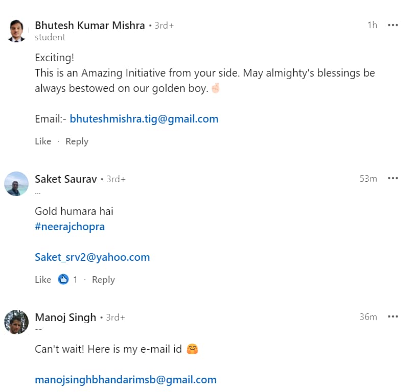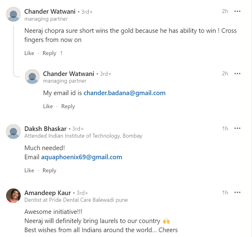 Another LinkedIn user stated, "Good Luck to Neeraj for winning the gold medal & cheers to you Mohakji for ur love for sports."