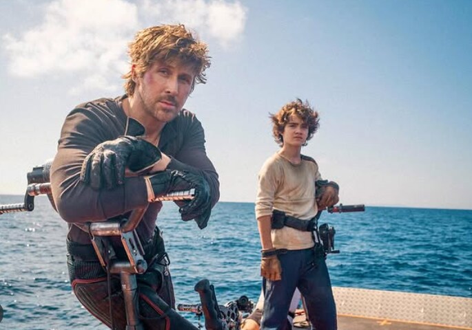 The photo showcases Ryan Gosling and Flynn Gray in full gear, with the former wearing a rugged, windswept haircut with a dark tactical outfit with leather gloves and utility straps.