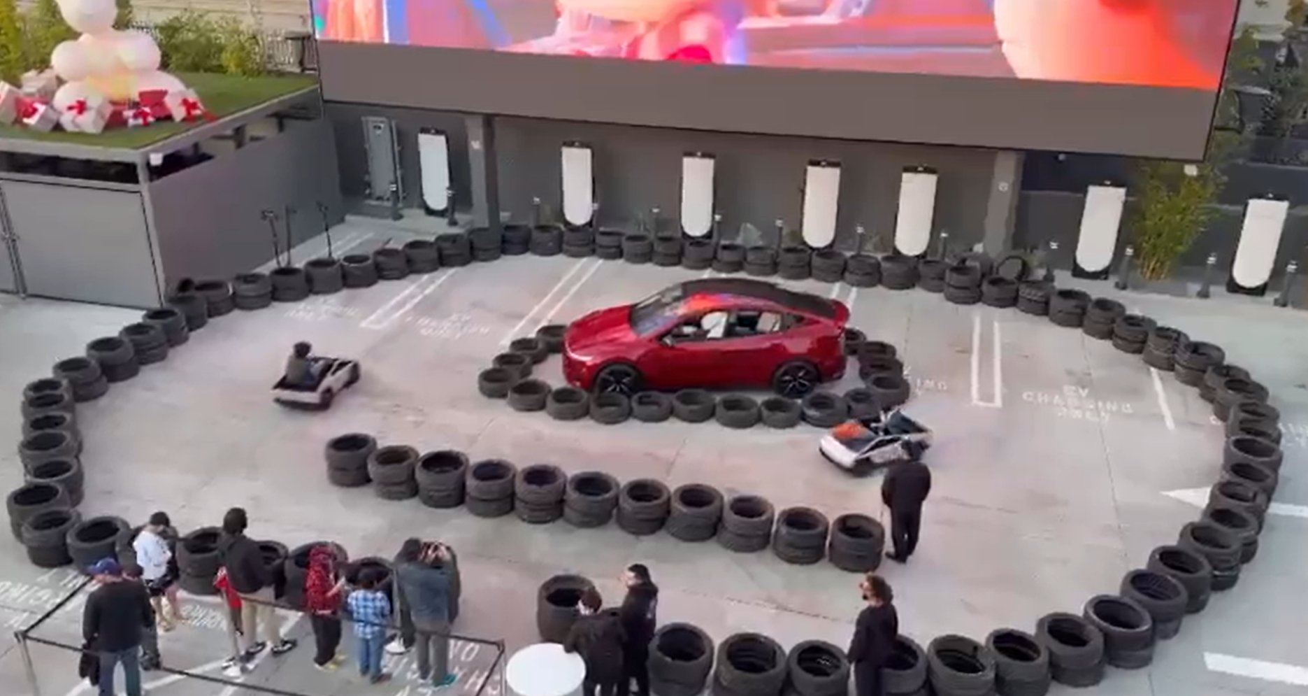 In the background, Tesla Superchargers and a large glowing screen light up the scene, adding to the spectacle. Musk replied to the clip, calling the setup “super cute.”