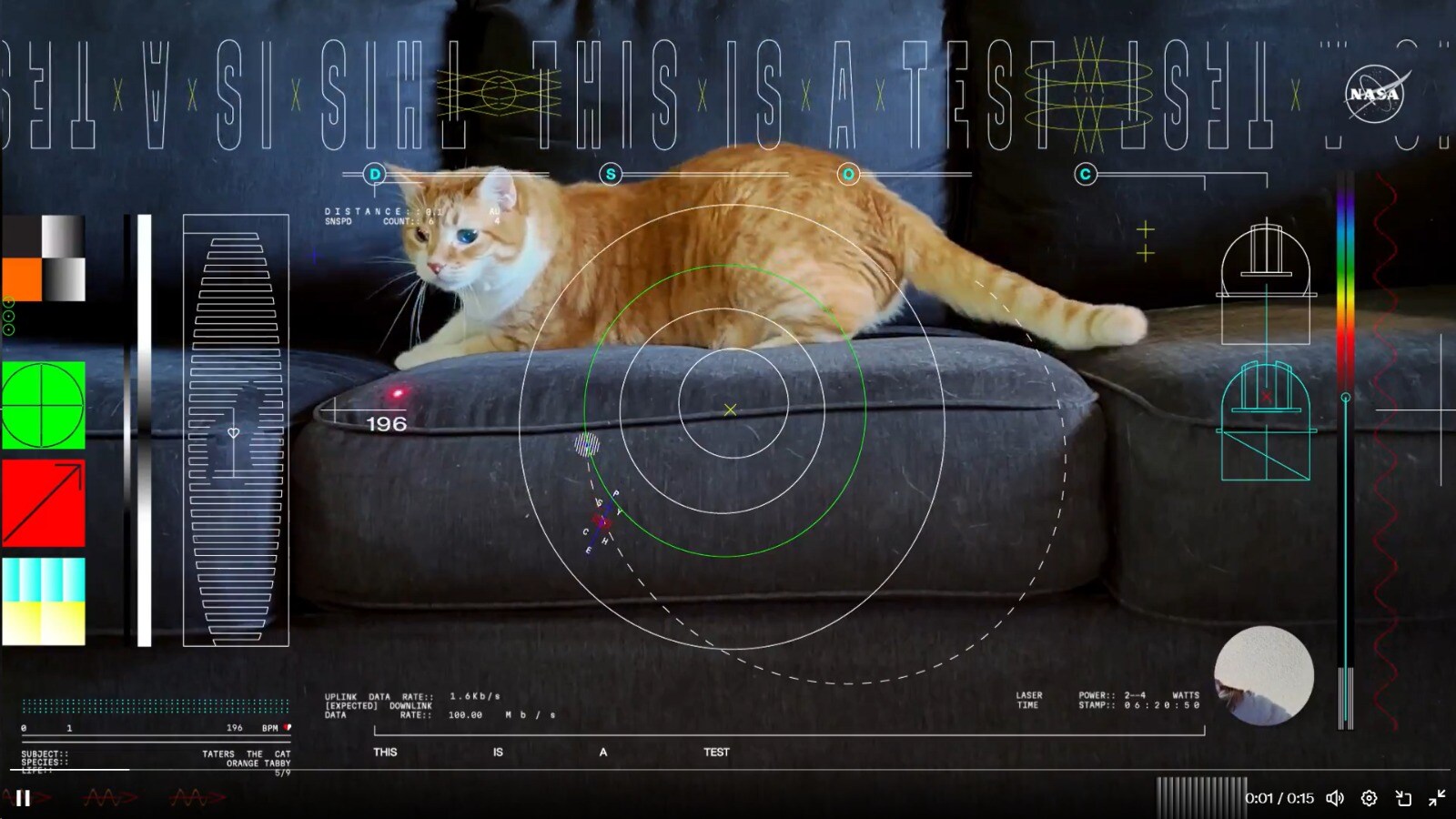 Uploaded before launch, the short ultra-high definition video features an orange tabby cat named Taters, the pet of a JPL employee, chasing a laser pointer, with overlayed graphics.