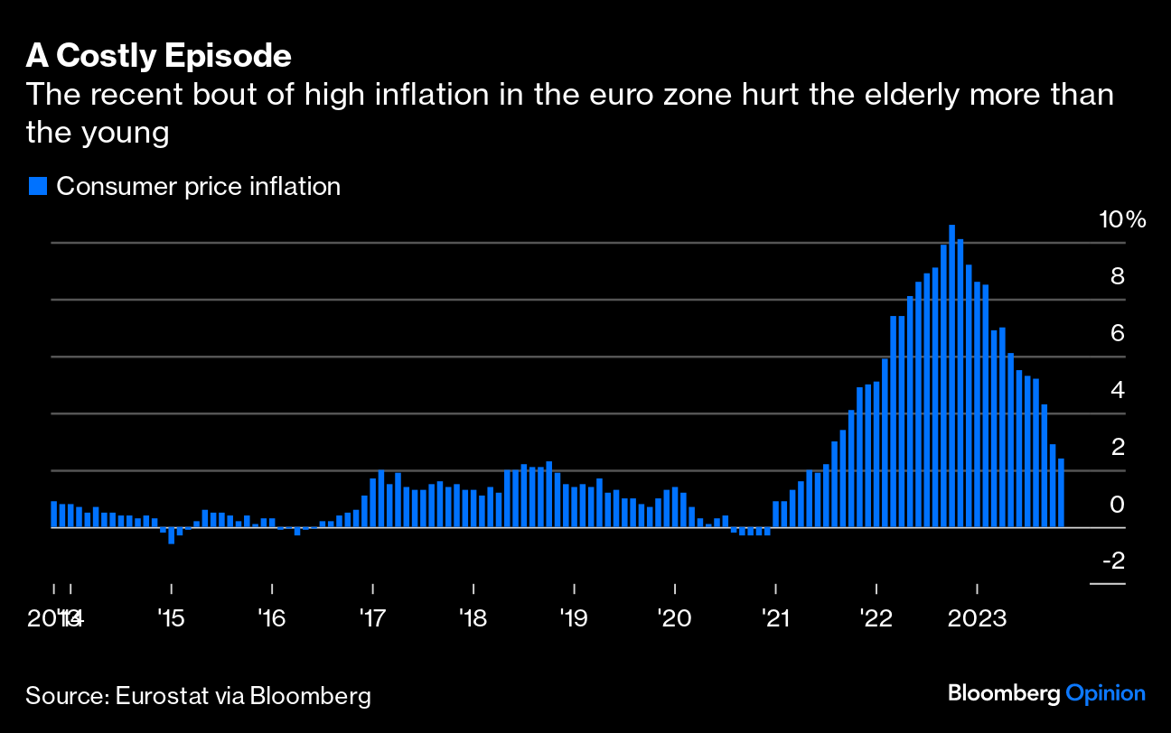 (Bloomberg Opinion) -- The unexpected decline of the rate of inflation in the euro zone, to 2.4% from 10.6% a year ago, will limit the strain on European economies and lower the risk that some European voters will opt for demagogic leaders. But it's not all good news. Despite the decrease, this inflation episode reflects the ongoing inability of EU nations to balance the interests of young and old.