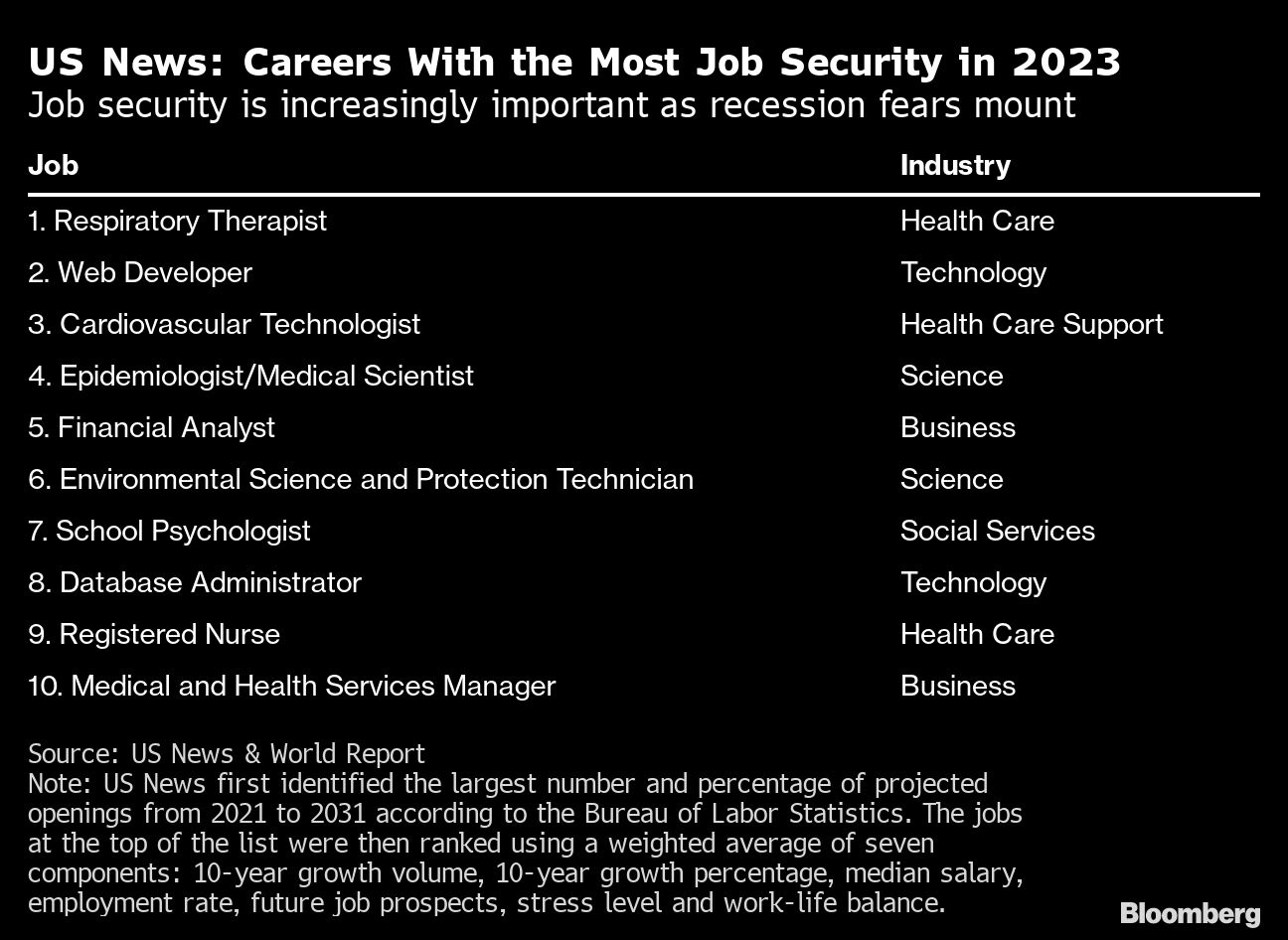 US News analyzed data from the Bureau of Labor Statistics to rank jobs by hiring demand, growth, median salary, employment rate, future job prospects, stress level and work-life balance.Â