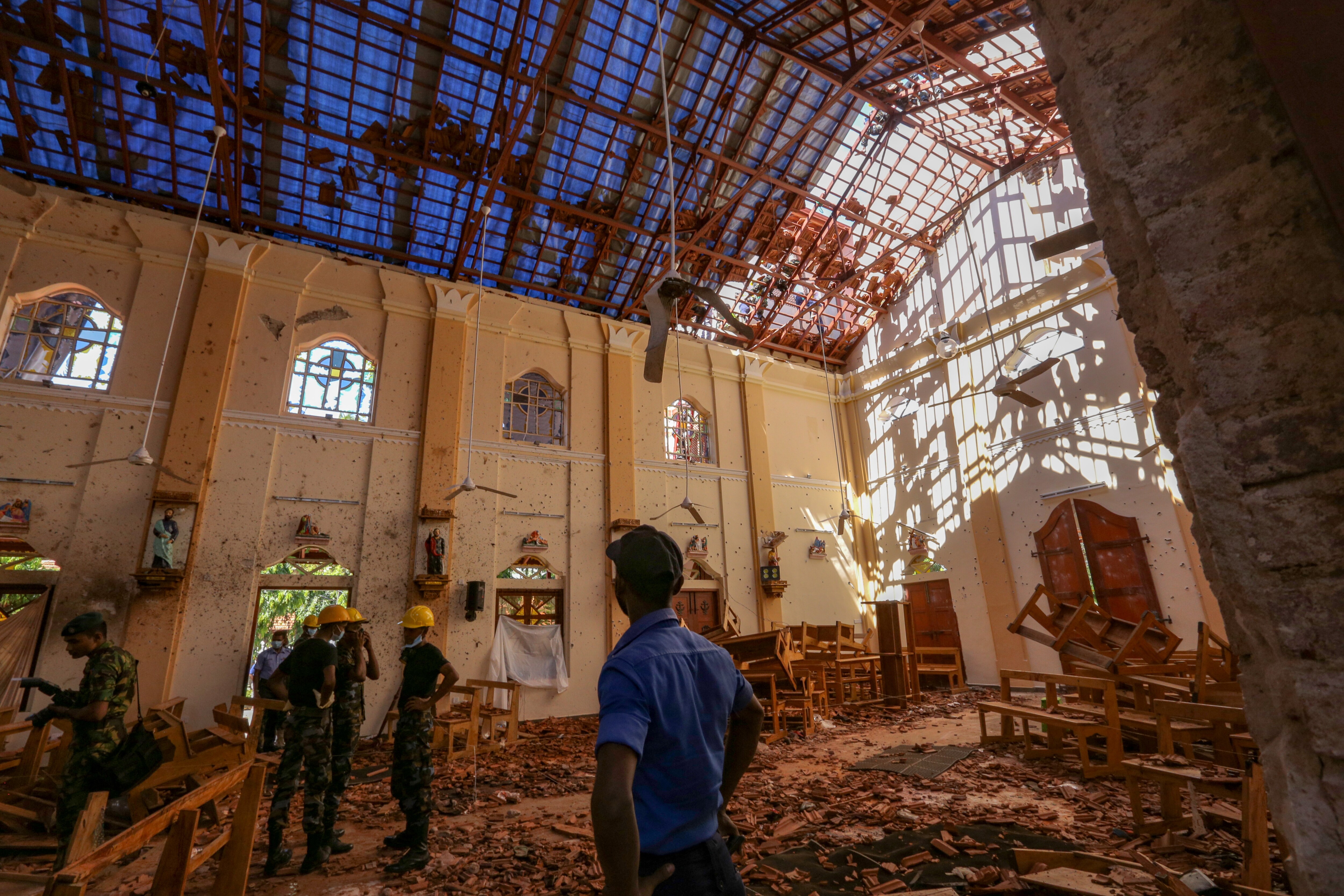 Sri Lankan soldiers inspect the damage inside St. Sebastian’s Church where a bomb blast took place in Negombo, Sri Lanka. (Photographer: Tharaka Basnayaka/Bloomberg)