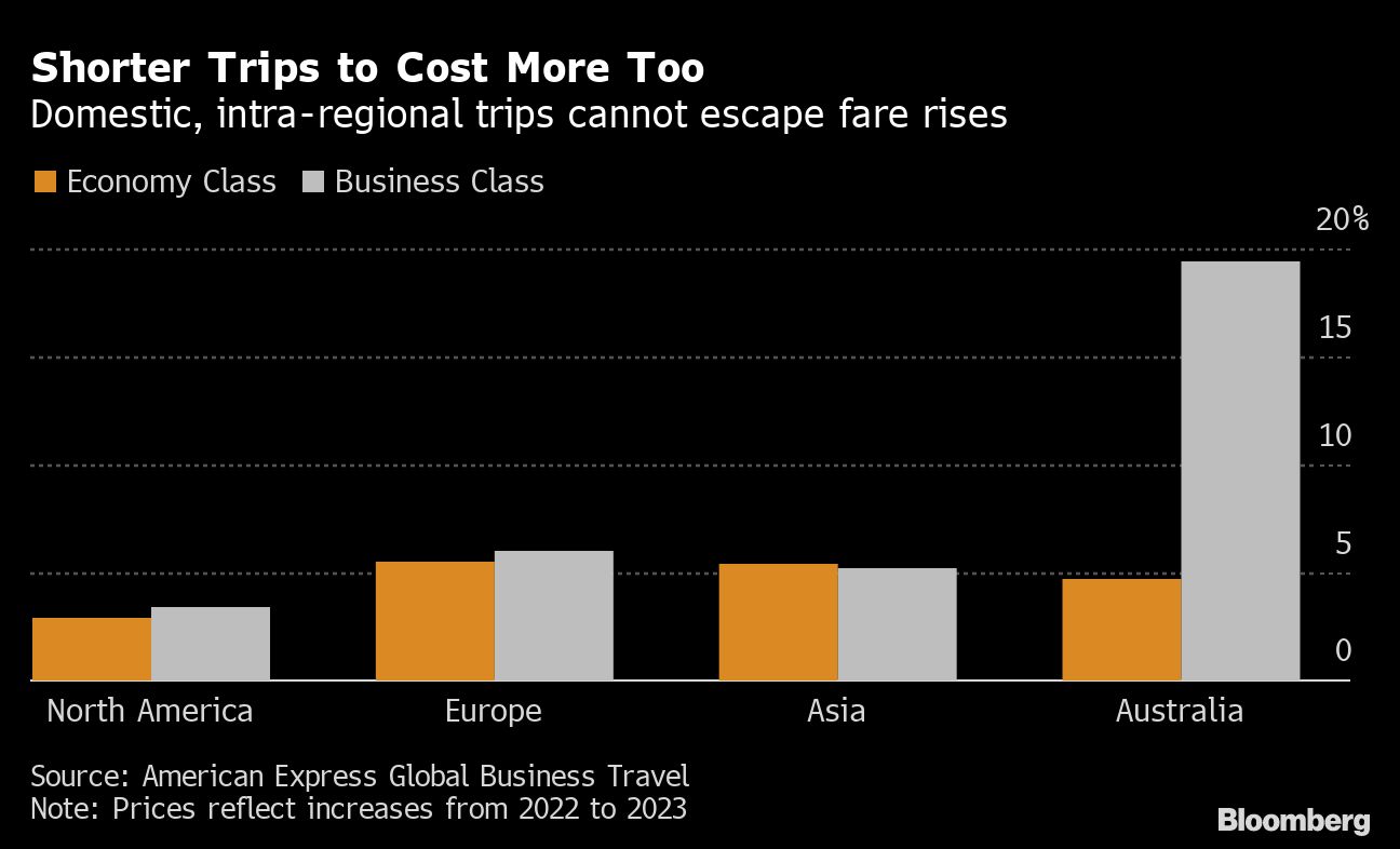 With Europe also seeing a shortfall of airline capacity versus demand, intra-regional airfares are expected to climb 6% in business and 5.5% in economy next year, Amex GBT said. The increase won't be as sharp within North America, where fares are set to rise about 3% in both cabin classes. North America-Europe fares will be 3.7% higher than 2022.