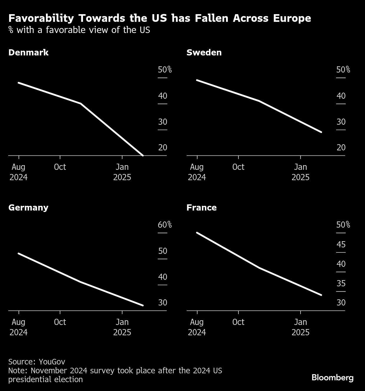 There's currently no country in Europe where more than half of the population has a positive attitude toward the US, according to a YouGov poll published March 4. Opinion soured the most in Denmark, where leaders and residents were riled by Trump's plans to take control of Greenland.