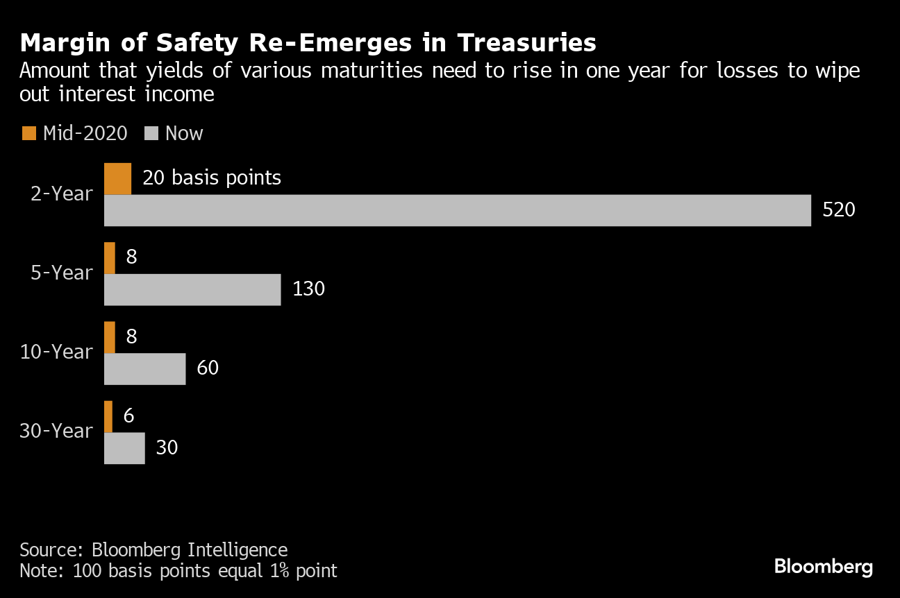 The numbers tell the story. Last year, investors pocketed nearly $900 billion in annual interest from US government debt, double the average over the previous decade. That's set to rise as just about all Treasuries now carry yields of 4% or more. In mid-2020, none did. Because of the higher interest, investors are also better shielded against any jump in yields. Currently, rates would need to go up by over three-quarters of a percentage point over the next year before Treasuries start to lose money, at least on paper.