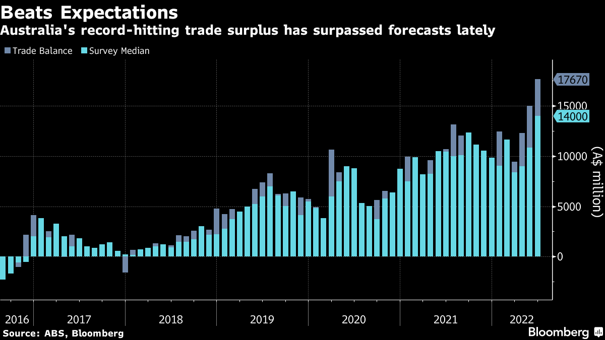 The surplus swelled to A$17.7 billion ($12.3 billion) in June, surpassing economists' estimate of A$14 billion, Australian Bureau of Statistics data showed on Thursday. Exports jumped 5%, while imports rose 1% as more Australian holidaymakers traveled overseas.