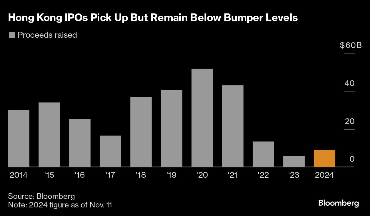 Hong Kong IPOs have raised about $9 billion this year, a significant increase from 2023's level of $5.6 billion — which was the lowest since 2001. The Hang Seng Index has climbed almost 20% this year, buoyed by the Chinese government's efforts to stimulate the economy. The gauge slumped an annual average of 12% in the past four years.