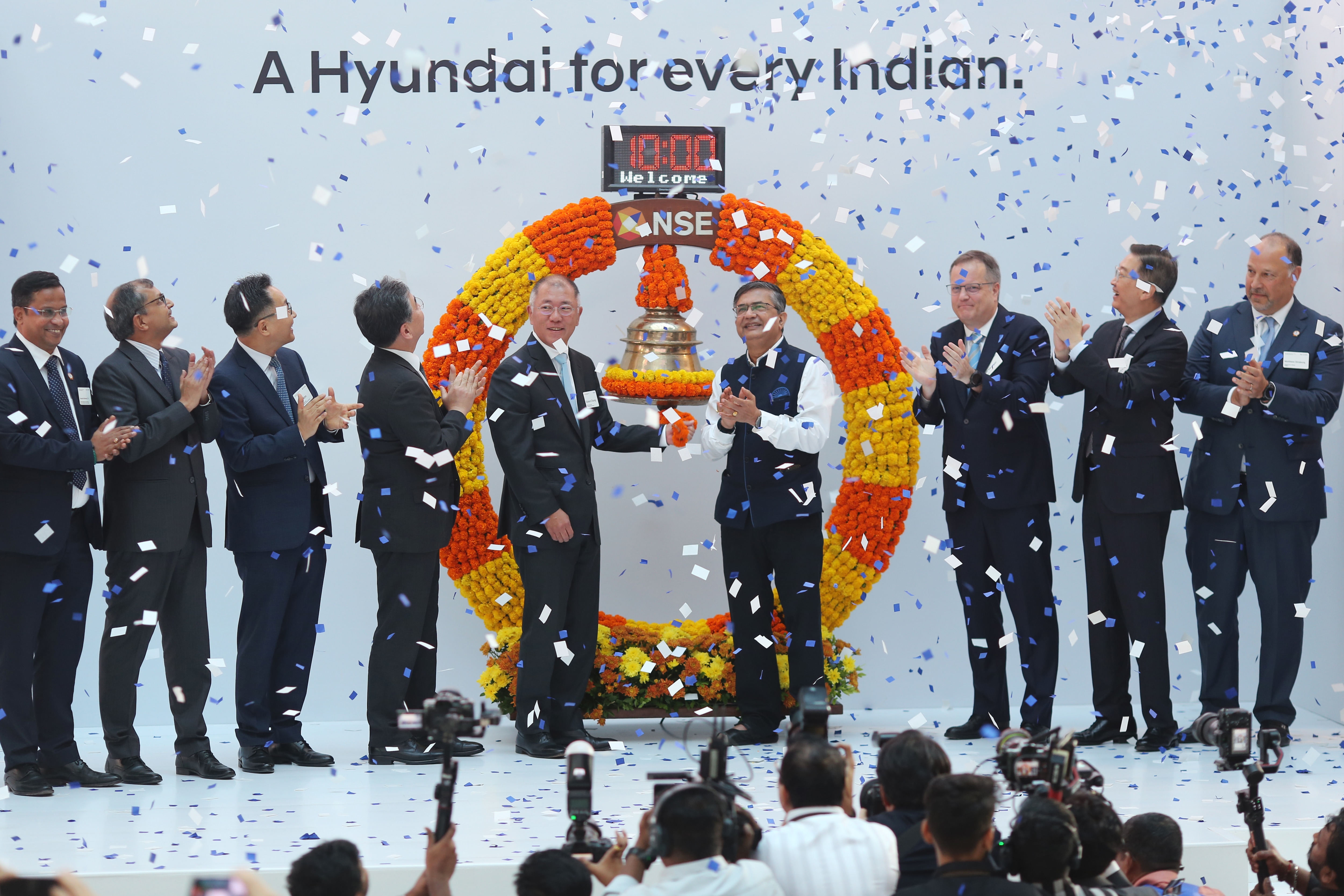 Confetti falls during the listing ceremony of Hyundai Motor India Ltd. at the National Stock Exchange (NSE) in Mumbai on Oct. 22. (Photographer: Dhiraj Singh/Bloomberg)