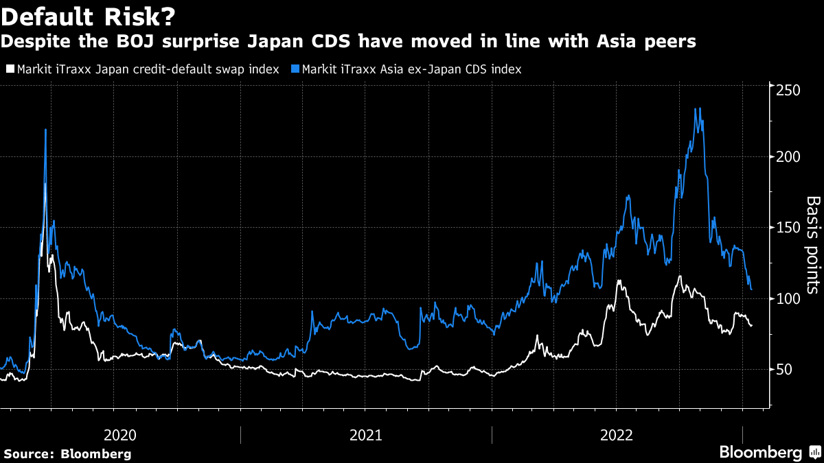 But given that almost all Japanese issuers have investment-grade credit ratings, so far market gauges of default risk aren't reflecting much impact from the BOJ move. If anything, Markit iTraxx indexes show Japan credit-default swaps falling in recent weeks, in line with their Asian counterparts.