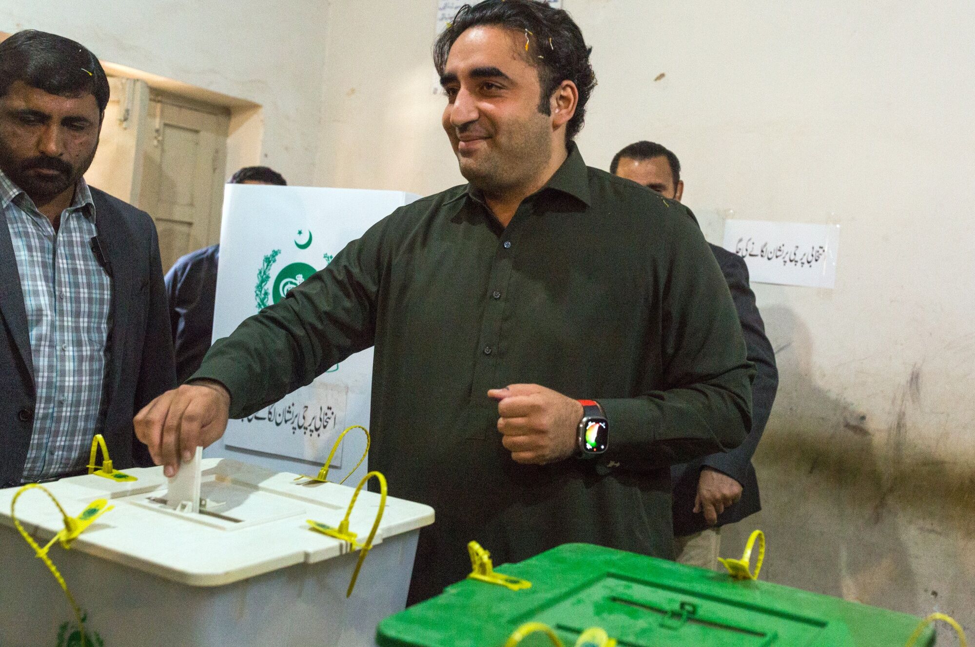 Bilawal Bhutto Zardari, chairman of Pakistan Peoples Party (PPP) and former foreign minister, casts his ballot at a polling station in Lakarna, Pakistan, on Thursday, Feb. 8, 2024. Pakistan suspended mobile phone services as voters lined up to cast ballots in its general election Thursday, defending the measure as a way to maintain order even though critics said it would curb vital access to information during the controversial polls.