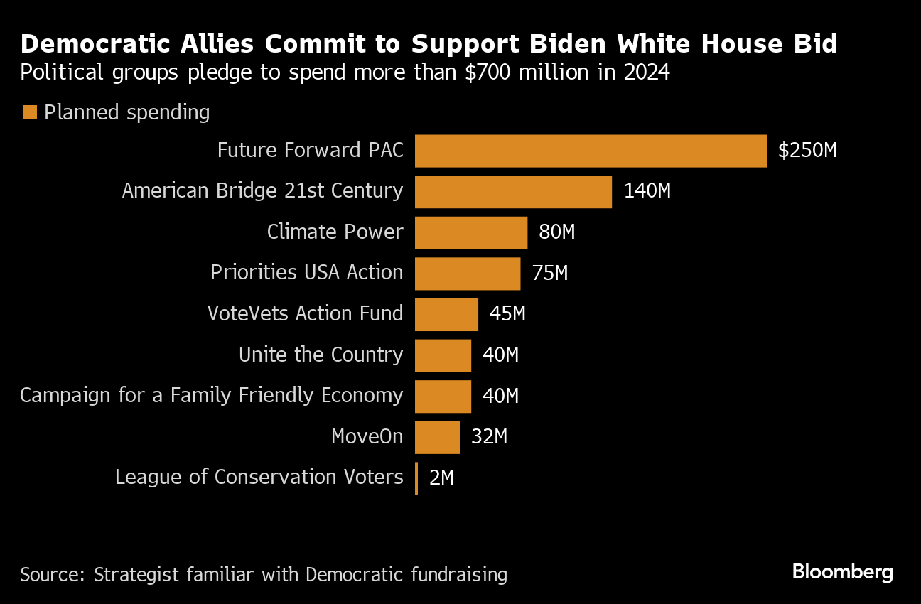The $700 million pledged by Biden-allied groups will help Democrats invest in advertising and other messaging efforts to help buoy the president's flagging poll numbers amid concerns about his handling of the economy and immigration. He trails Trump in seven of the swing states that will likely decide the presidential election, according to the latest Bloomberg News/Morning Consult poll.