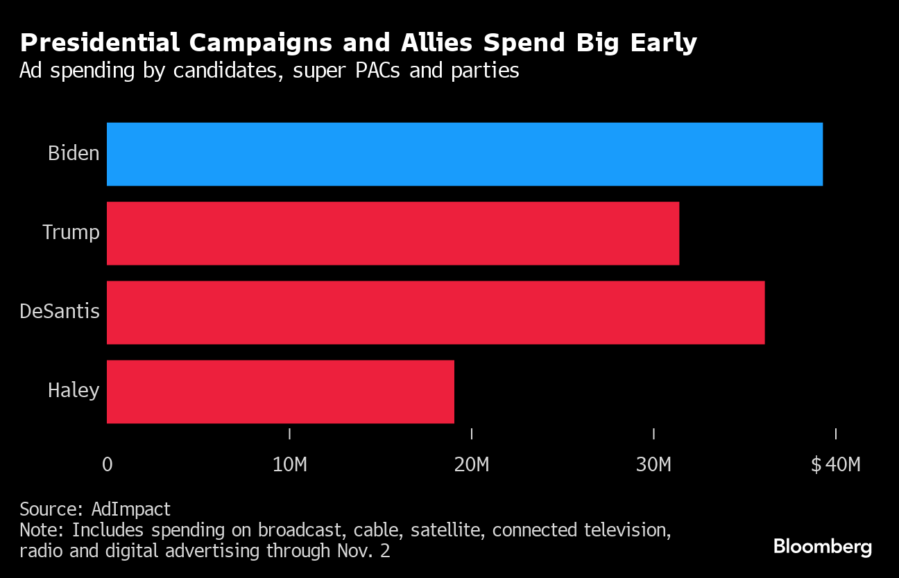Biden, the Democratic National Committee and an allied super political action committee have spent $39 million on advertising through Nov. 2, according to data from AdImpact, a firm tracking ad spending in elections. That's more than the $31 million Trump, the frontrunner for the GOP nomination, and his associated super PAC have spent. Florida Governor Ron DeSantis's team has shelled out the most, $36 million, of all the GOP primary candidates.