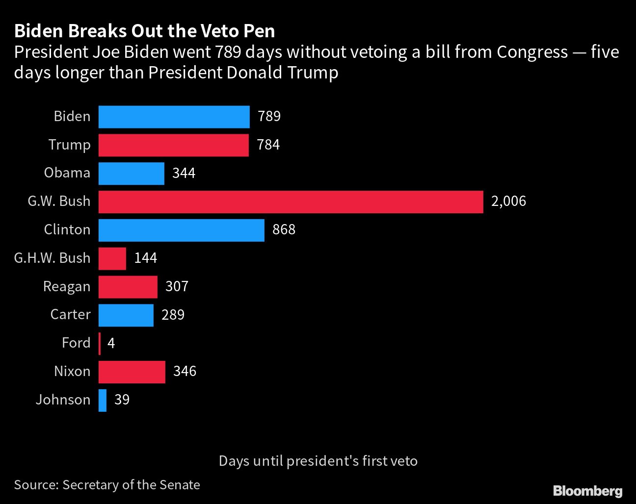 Former Presidents George W. Bush and Barack Obama each used their veto pen a dozen times during their two-term tenures, while Trump vetoed 10 Congressional bills, according to government data.