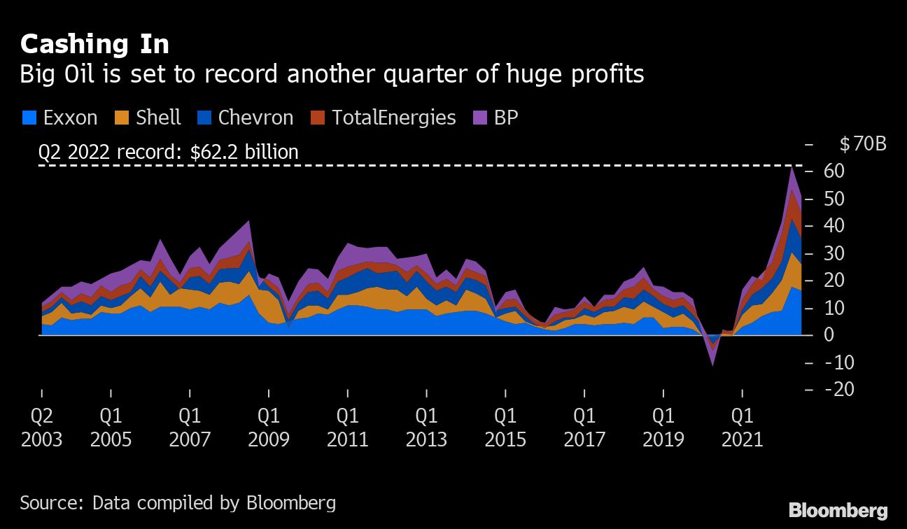 Exxon Mobil Corp., Chevron Corp., Shell Plc, TotalEnergies SE and BP Plc -- will report combined earnings of $50.7 billion in the third quarter, down from the second quarter's record of more than $62 billion, according to data compiled by Bloomberg.