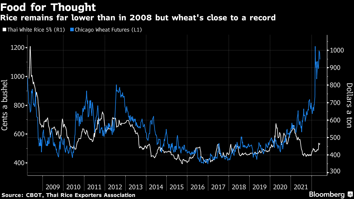 In fact, rice is in such abundance, it could help ease the pressure on wheat, which hit a record in March. Consumers in India, China and Southeast Asia can switch relatively easily from wheat to rice -- such as in noodles and cakes -- saving the market about 30 million to 40 million tons of wheat, Timmer said.