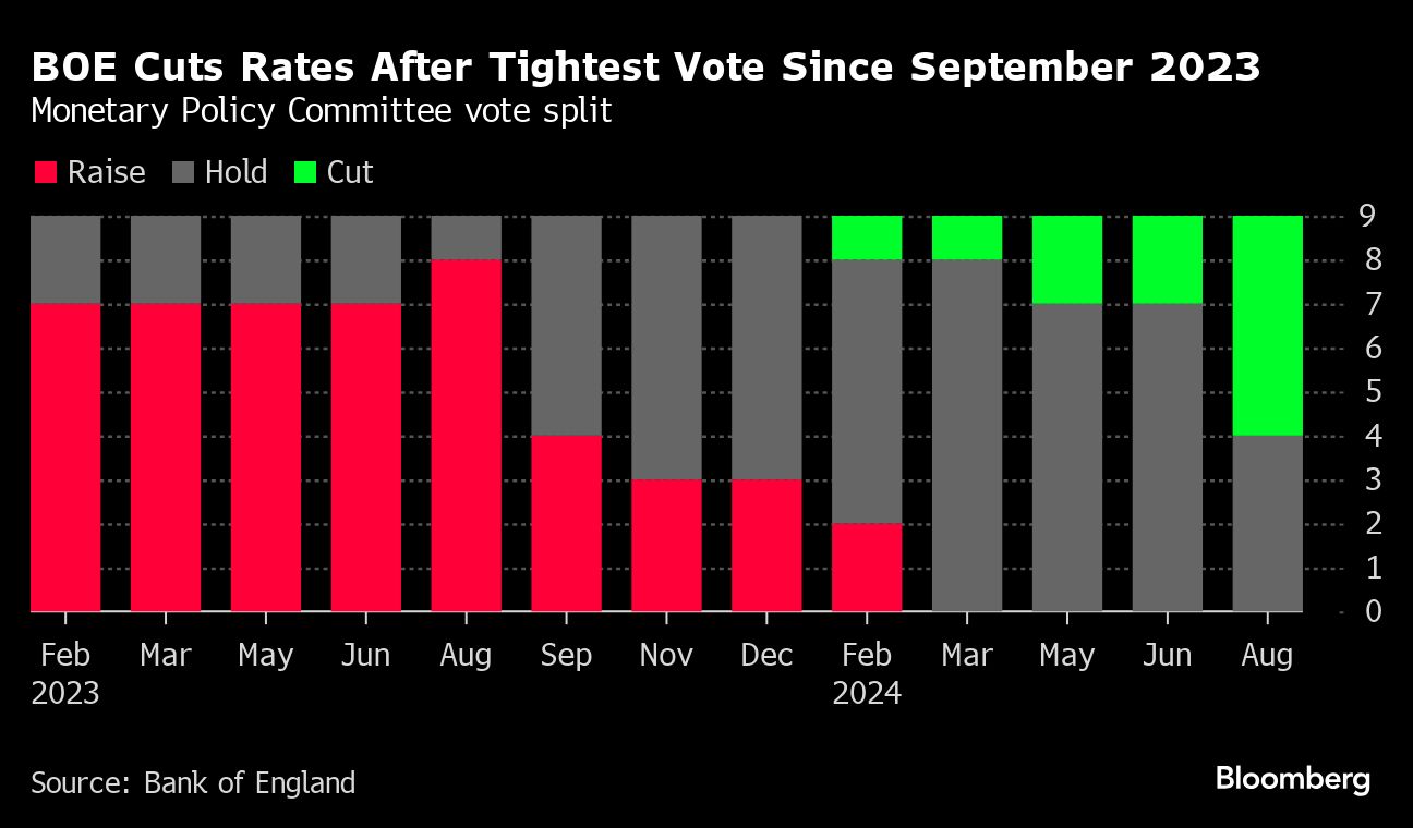 Governor Andrew Bailey's casting vote clinched the quarter-point drop in the benchmark to 5%. The decision was “finely balanced” for some of those supporting the move, and opposed by a minority of four on the nine-member Monetary Policy Committee, according to minutes of the meeting.