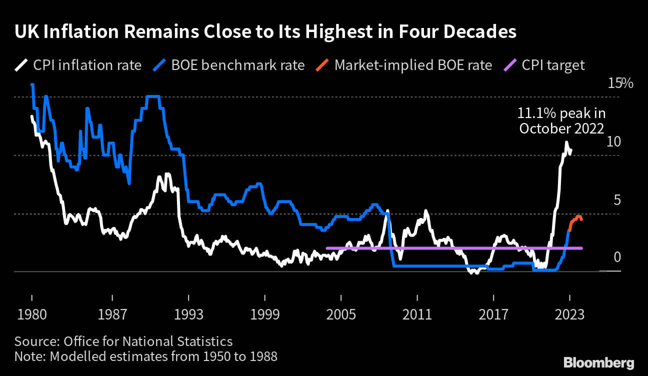 Those figures are a disappointment for the BOE, which along with the Office for Budget Responsibility expected CPI to average 9.7% in the first quarter and then to plunge rapidly toward the 2% target. They fuel concerns that inflation may be more persistent than the BOE hopes.
