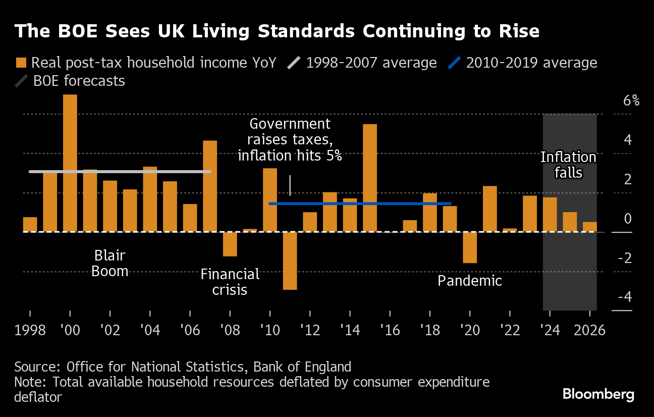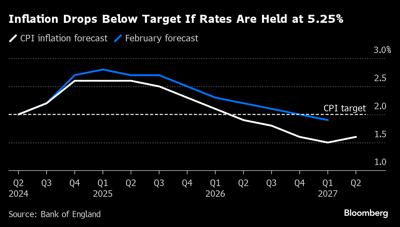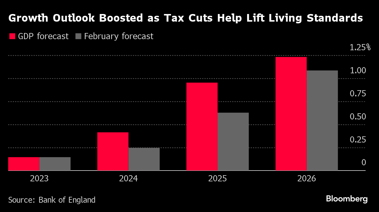 On the economy, the BOE estimated that last year's shallow recession has finished and that the economy will grow 0.5% this year and 1% in 2025. That's an upgrade from its February forecast for 0.25% and 0.75%.
