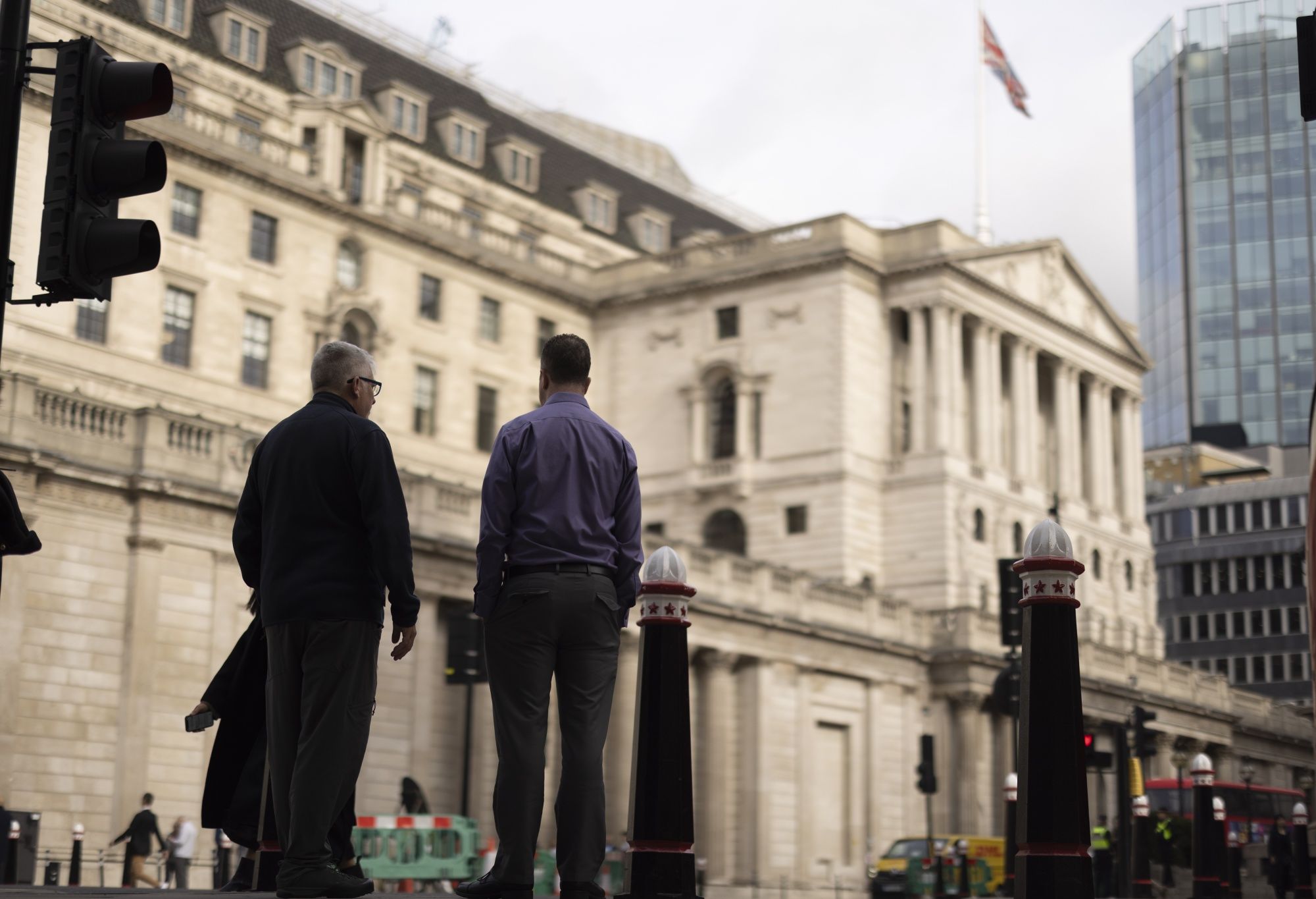 City workers stand in view of the Bank of England (BOE) in the City of London, UK, on Monday, Oct. 17, 2022. The Bank of England said it was restarting its corporate bond-selling as it looks to return to normality in the wake of a sustained selloff in UK assets.