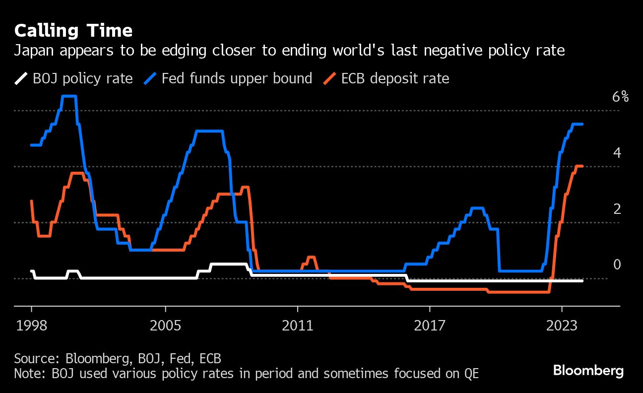 (Bloomberg) -- Bank of Japan Governor Kazuo Ueda continued to prepare the ground for the nation's first interest rate increase since 2007 with another round of comments that further build the case for a move in the spring while not ruling out the less probable option of a January hike.
