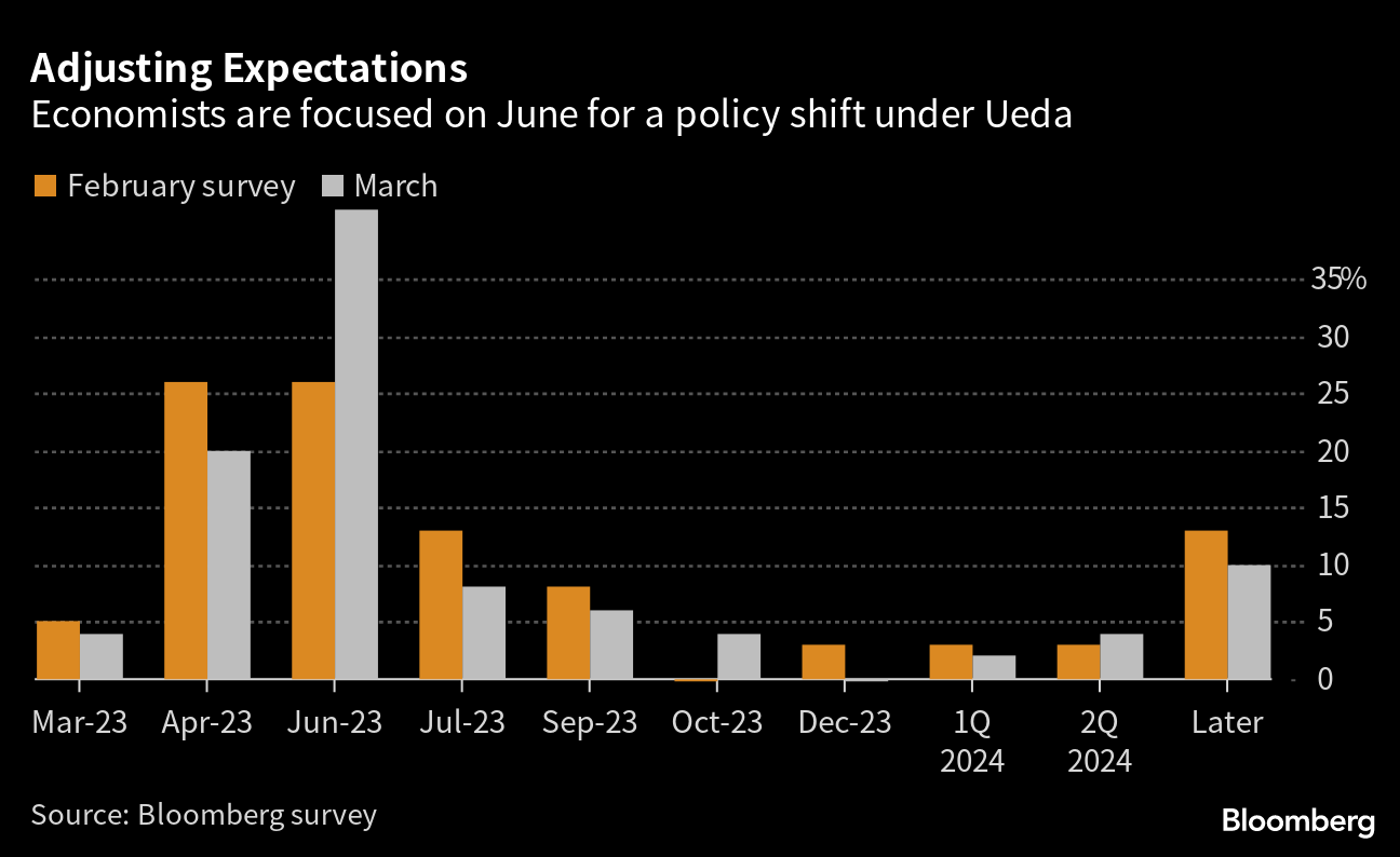 Academic Kazuo Ueda will be replacing Haruhiko Kuroda as governor of the BOJ this weekend, and faces the thorny problem of what to do with a complicated policy framework that has resulted in the buying of assets larger than the size of Japan's economy. Nakao's calls for a policy adjustment add to a majority of economists expecting change from the BOJ by June, according to a survey conducted around a month ago.