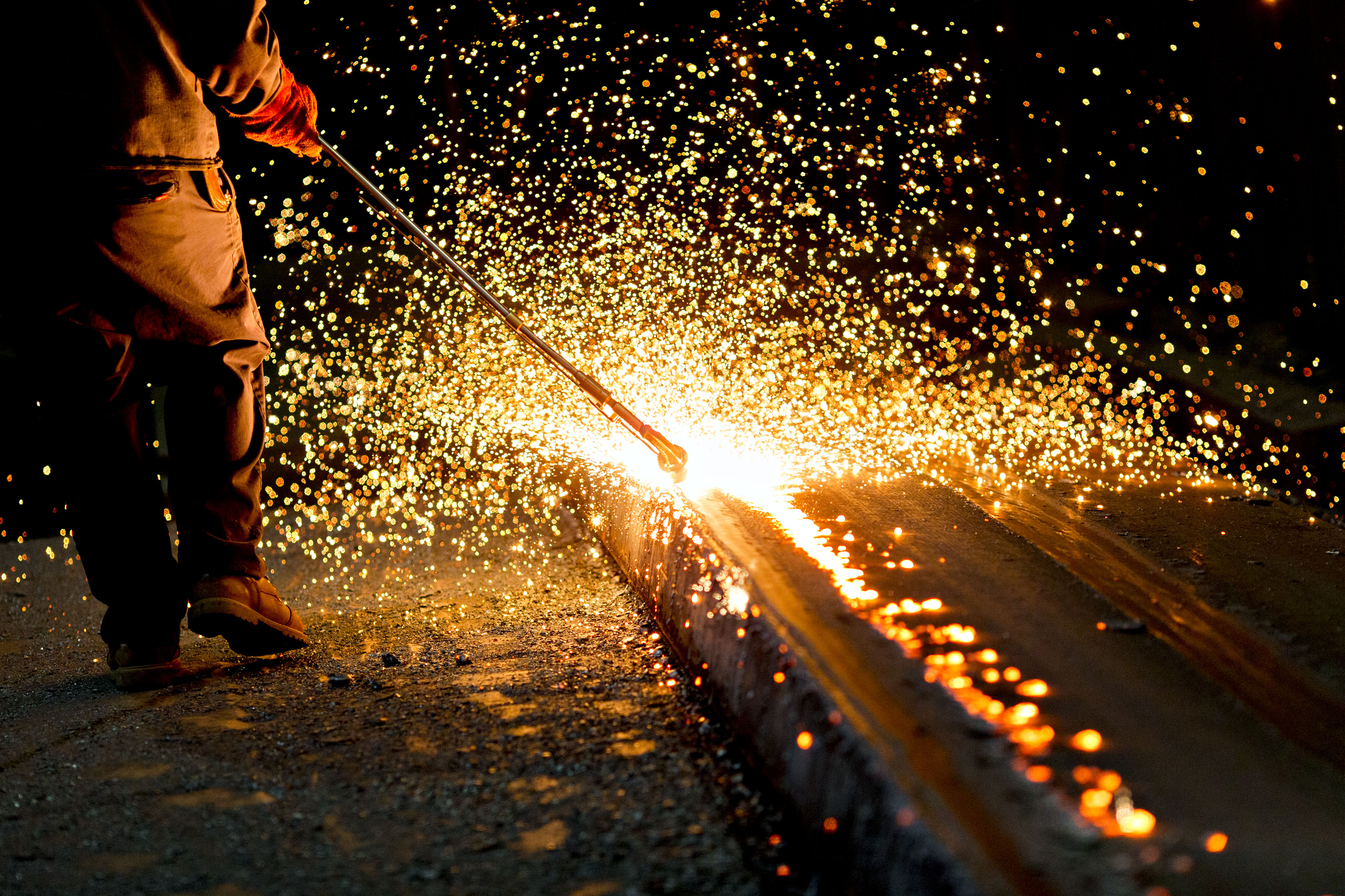 An employee scarfs a steel slab during production at the at a facility. (Photographer: Daniel Acker/Bloomberg)