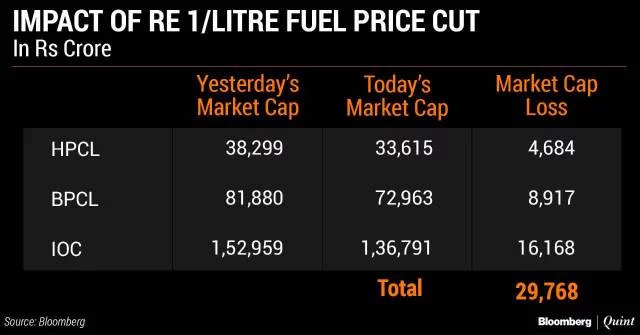 - Shares of oil marketing companies slumped after the announcement, wiping out nearly Rs 30,000 crore in market capitalisation.