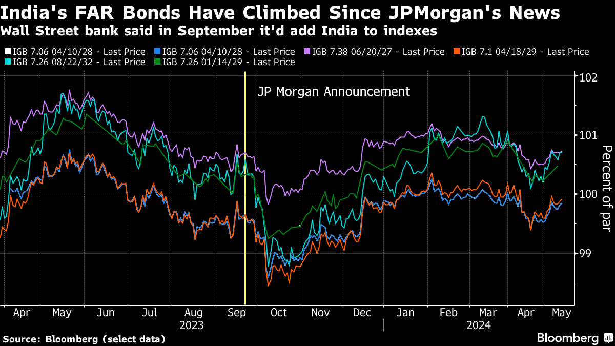 Indian sovereign bonds have seen about $8 billion of inflows into the so-called Fully Accessible Route — or FAR securities — since the JPMorgan announcement, though there were some outflows in April amid a global debt selloff. The FAR bonds have no restrictions for foreign investors.