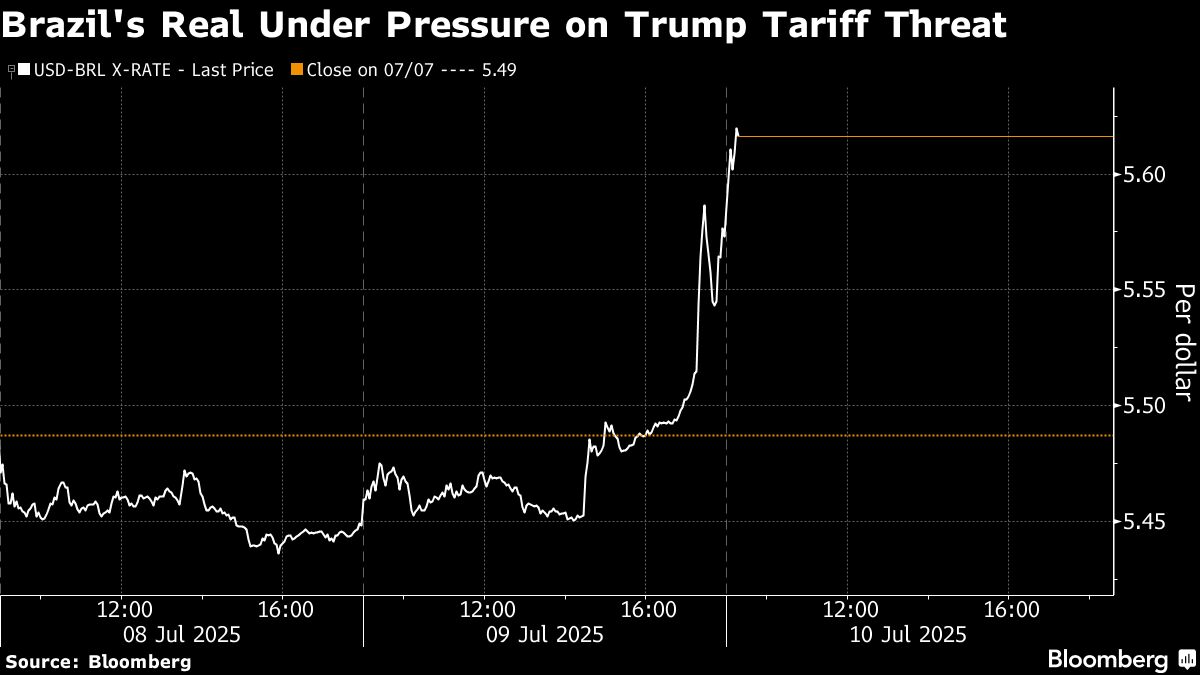 Brazilian assets dropped as President Donald Trump's threat to impose 50% tariffs on all goods from the South American nation rippled through markets.