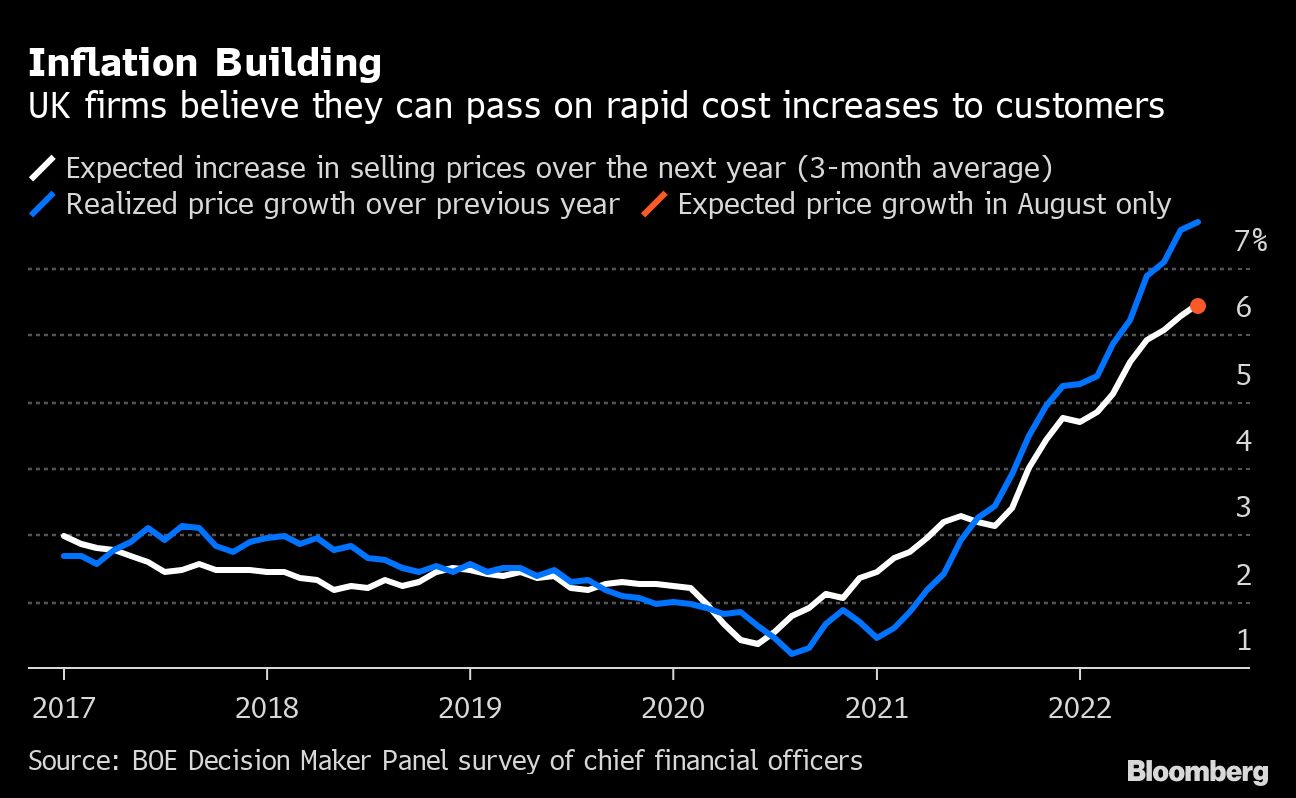 (Bloomberg) -- UK company executives anticipate inflation will remain well above the Bank of England's target for at least three years and are responding by raising prices.