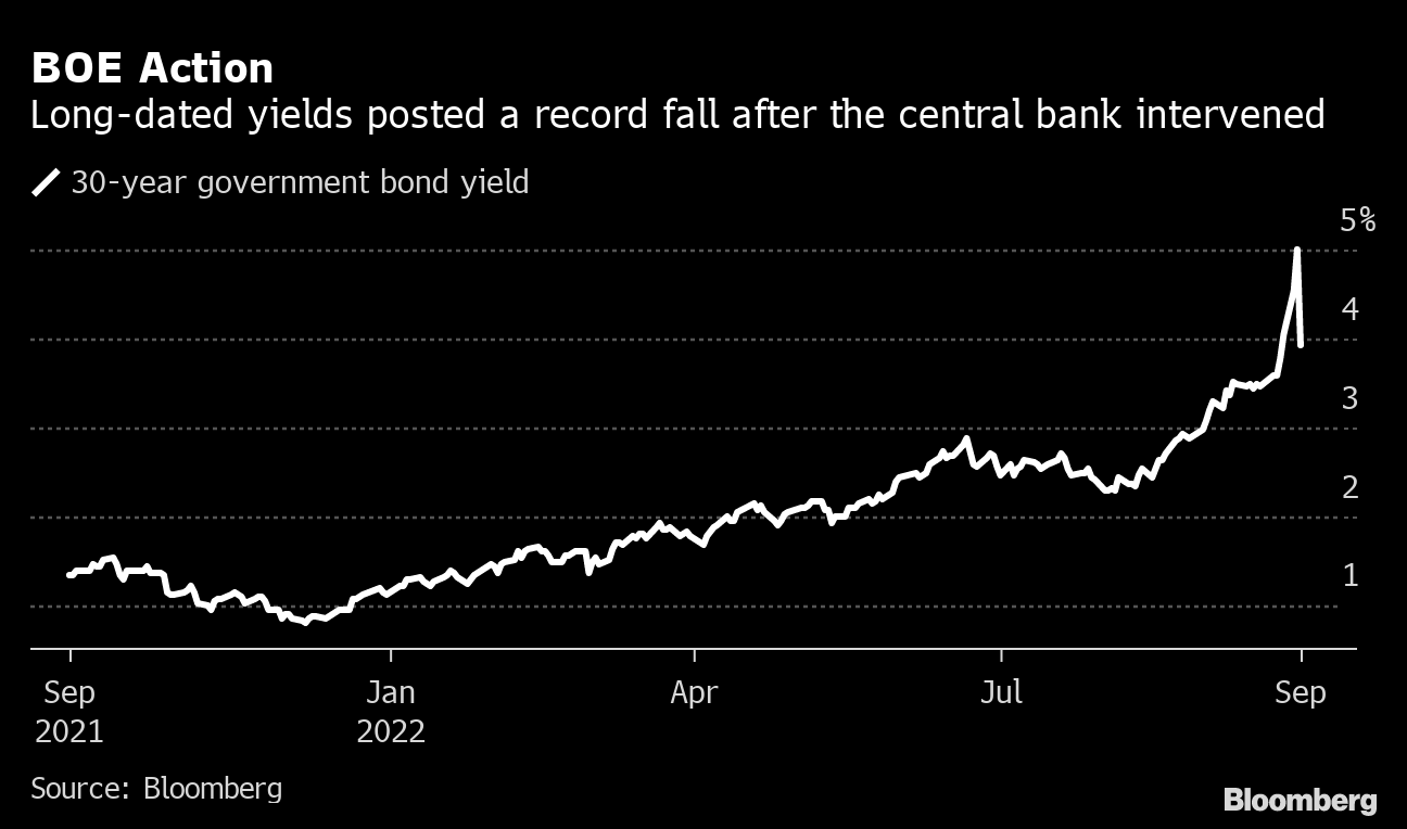 The BOE is now all but guaranteed to respond to the looser fiscal policy with tighter monetary policy. Money market traders are now betting on at least a 150 basis-point rise in interest rates by policymakers' next gathering on Nov. 3. Setting aside the risk of an emergency hike outside of scheduled meetings, that would be a move unprecedented since the bank was granted independence by the government in 1997. Pricing also shows the benchmark rate will almost certainly hit 6% next year.