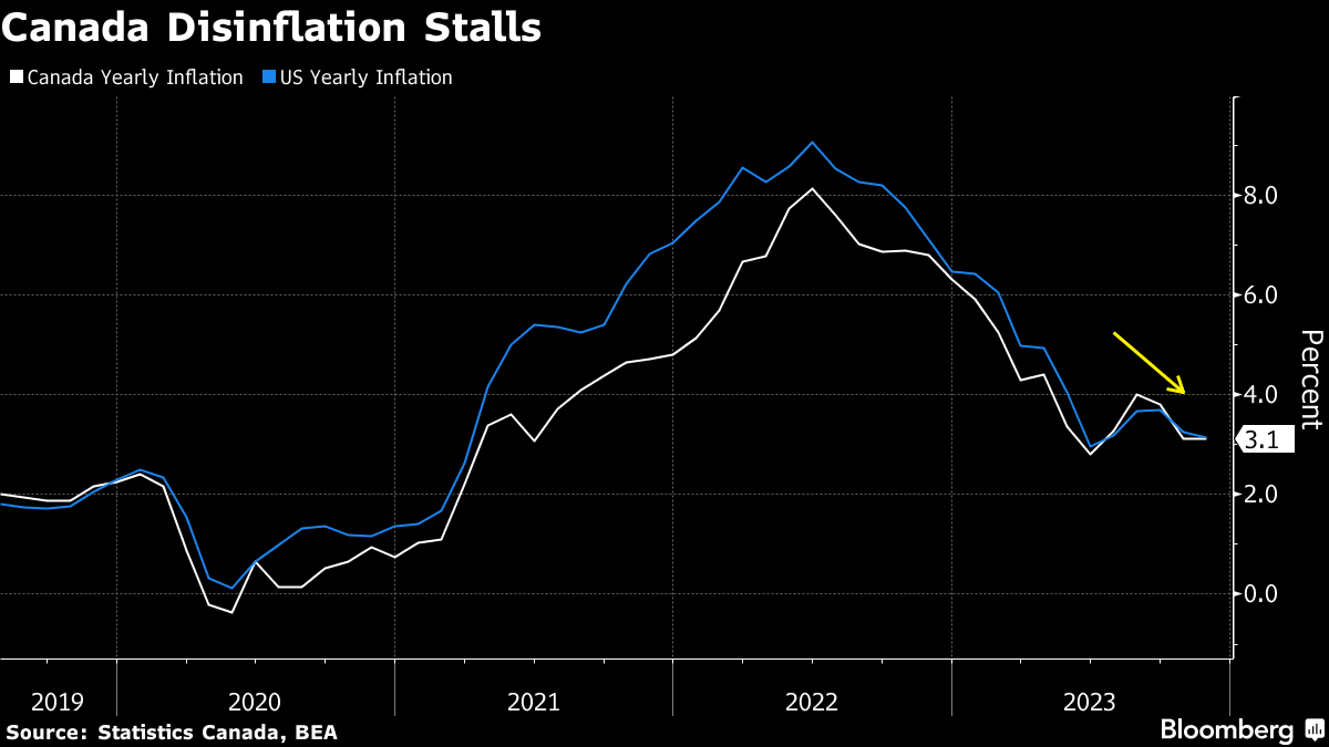 The rate of inflation in Canada unexpectedly remained stuck at 3.1% last month, giving the central bank another reason to keep its policy rate at the highest level in two decades.