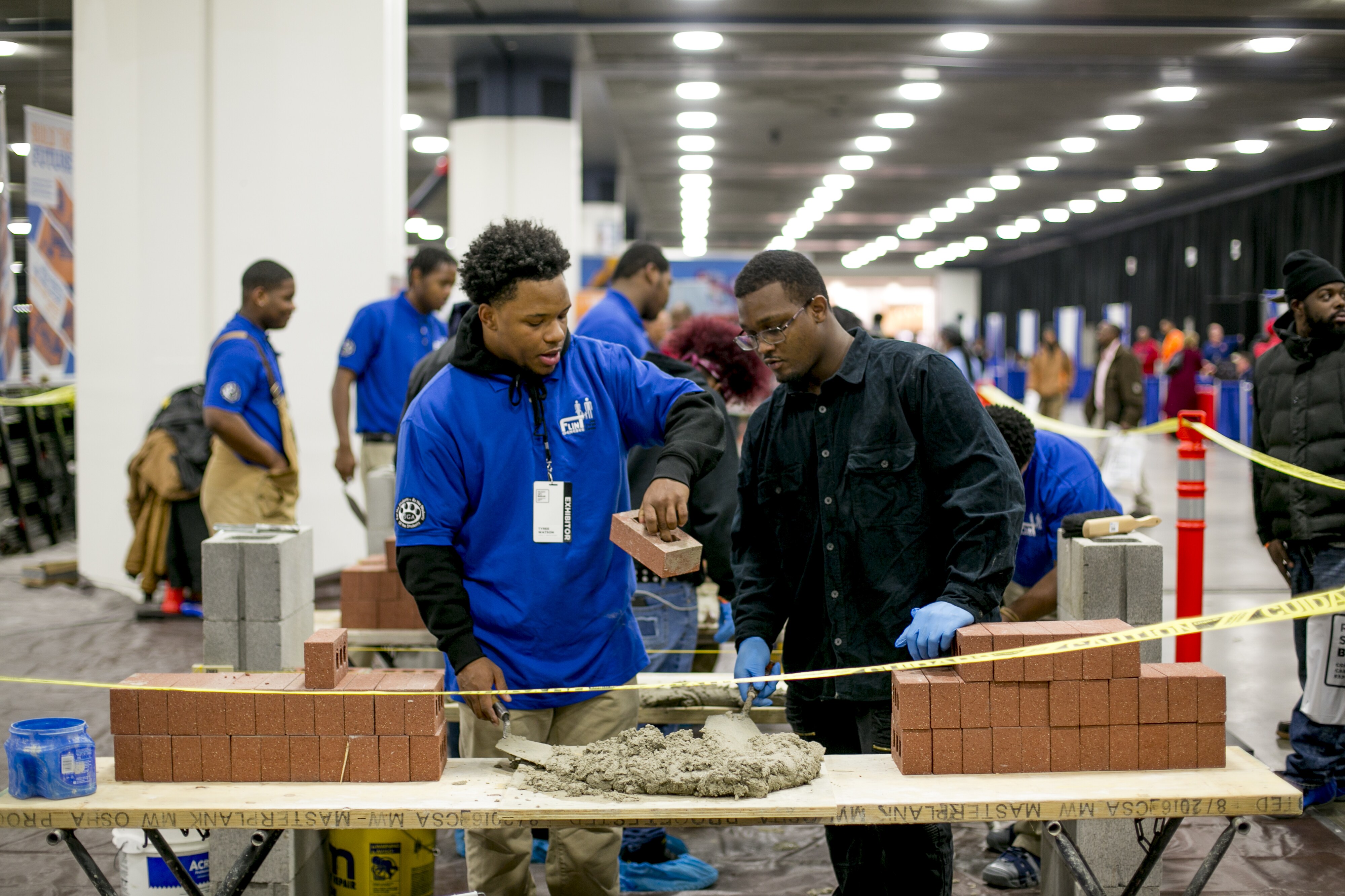 A Flint/Genesee Jobs Corps Center representative demonstrates masonry techniques to a job seeker (Photographer: Anthony Lanzilote/Bloomberg)